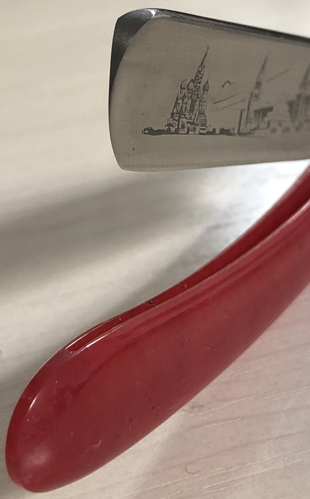 Опасная бритва ТрудВача "ГРАВЮРА" 1962 года выпуска, с изображением Красной площади. Ширина полотна-19 мм Толщина обушка-4.5 мм Полная вогнутость. Углеродистая сталь. Бритва имела защитную пленку на клинке, от коррозии, а также присутствует след от электрохимической заточки.Бритва не требовала никаких посторонних вмешательств, так как с 1962 года остается в превосходном состоянии, как будто только вчера с завода. Идеальная геометрия полотна:кромочка равномерна по всей длине.Оригинальная "инструкция" и коробочка в комплекте. Бритва имеет заводскую заточку, качество которой мне удалось проверить на себе лично. Хотя, после продажи я немного ещё поработаю на финишном камне и произведу тонкую доводку, для порядка. Красивая бритва, с оправой "пролетарского" цвета и четким изображением на полотне, будет редким и достойным экземпляром для любой коллекции. Не пропустите действительно редкую вещь! Цена-6300 р с доставкой. ПРОДАН Внимание! Важная информация! Spoiler Show