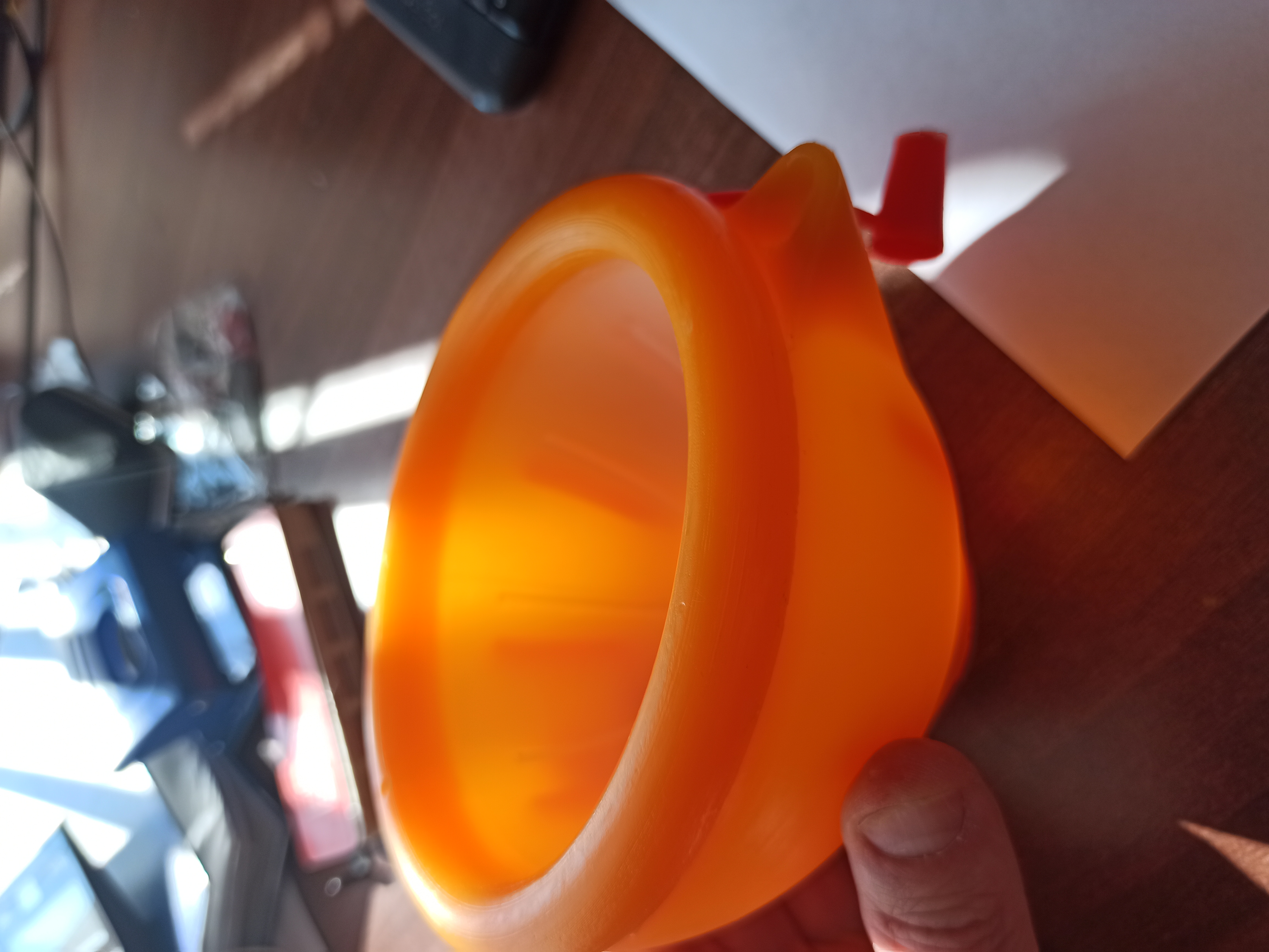 Тактильнолептические свойства. В руки взять приятно, аж выпускать не хочется(-: Тепловые качества. Залил в нутро и до верха рёбер воду t° = 54°; через 10 минут вода внутри оказалась 39°. Цвет (оранжевый). Очень понравился: не агрессивный, тёплый, но ещё приятней был бы поближе к обожжённой глине. Конструкция. Высота рёбер -- в самую жилу: мм 2-3, без излишества. Для удобства сливания теплоносителя из междустеночного пространства напротив носика есть отверстие для воздуха; оно работает как при заполнении, так и при опорожнении. Можно было бы дно сделать пошире -- для пущей устойчивости, дак оно и так не падает. Сказать, что я в восторге? От продуманности конструкции -- да, всё на высочайшем уровне, придраться просто не к чему.