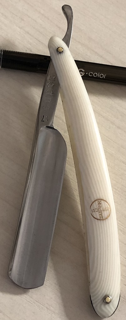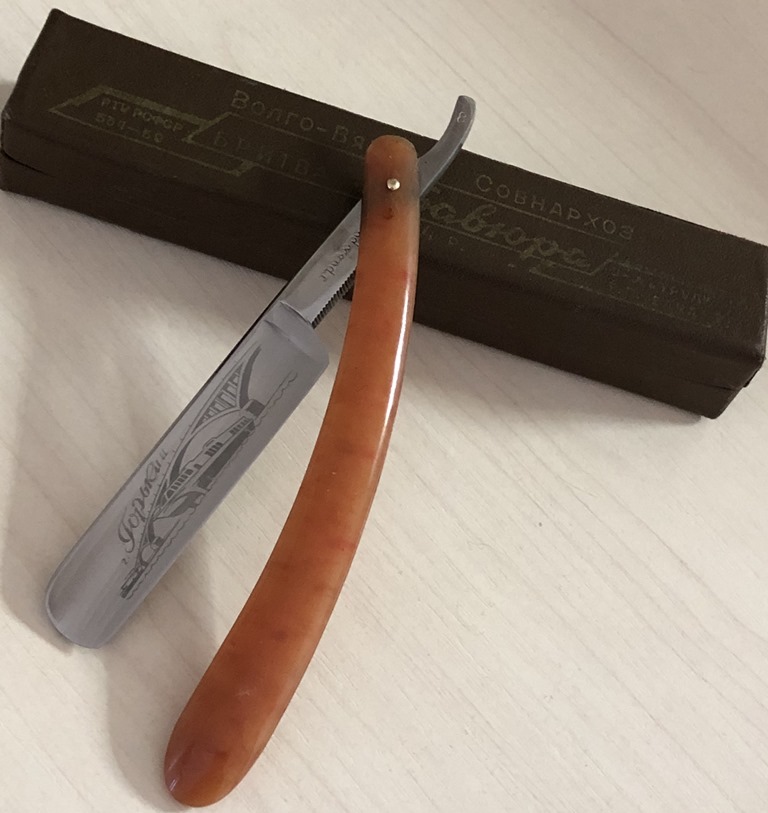 Очень долго лежали у меня две бритвы,на которые я совершенно не обращал внимания, по причине того, что чисто интуитивно они мне не понравились, а визуально сталь клинков показалась мне какой то странной. Но, недавно решил ими заняться и, честно скажу, в этот раз опыт и интуиция меня подвели. Помимо того, что обе бритвы были совершенно непользованными,но со "следами времени", то и сталь прекрасно точилась, доводилась на тонких натуральных абразивах, естественно с прохождением всевозможных тестов. Но, самое главное, первое бритье превзошло все мои ожидания. (обычно, когда у меня есть вопросы и сомнения по поводу той или иной бритвы, то после заточки, на момент бритья, беру с собой ещё одну проверенную бритву,чтобы нормально завершить процесс и не мучить себя некачественным бритьём).Бритье показалось близкое к эталонному, без каких либо неудобств, раздражений и прочих неприятных ощущений. К тому же, сама бритва имеет средний размер и по многим показателям идеально подойдет для новичка,ну а для опытного товарища вообще говорить не приходится. Так как первая бритва так и не дошла до моей темы продаж и была сразу продана, то представлю второй экземпляр.