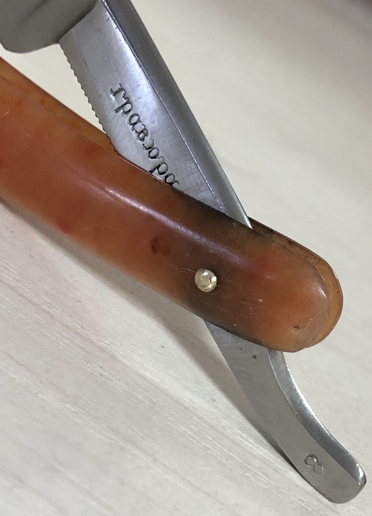 Очень долго лежали у меня две бритвы,на которые я совершенно не обращал внимания, по причине того, что чисто интуитивно они мне не понравились, а визуально сталь клинков показалась мне какой то странной. Но, недавно решил ими заняться и, честно скажу, в этот раз опыт и интуиция меня подвели. Помимо того, что обе бритвы были совершенно непользованными,но со "следами времени", то и сталь прекрасно точилась, доводилась на тонких натуральных абразивах, естественно с прохождением всевозможных тестов. Но, самое главное, первое бритье превзошло все мои ожидания. (обычно, когда у меня есть вопросы и сомнения по поводу той или иной бритвы, то после заточки, на момент бритья, беру с собой ещё одну проверенную бритву,чтобы нормально завершить процесс и не мучить себя некачественным бритьём).Бритье показалось близкое к эталонному, без каких либо неудобств, раздражений и прочих неприятных ощущений. К тому же, сама бритва имеет средний размер и по многим показателям идеально подойдет для новичка,ну а для опытного товарища вообще говорить не приходится. Так как первая бритва так и не дошла до моей темы продаж и была сразу продана, то представлю второй экземпляр.