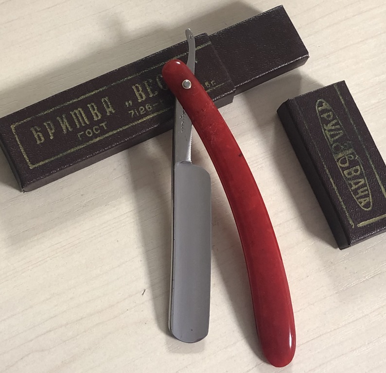 Очень долго лежали у меня две бритвы,на которые я совершенно не обращал внимания, по причине того, что чисто интуитивно они мне не понравились, а визуально сталь клинков показалась мне какой то странной. Но, недавно решил ими заняться и, честно скажу, в этот раз опыт и интуиция меня подвели. Помимо того, что обе бритвы были совершенно непользованными,но со "следами времени", то и сталь прекрасно точилась, доводилась на тонких натуральных абразивах, естественно с прохождением всевозможных тестов. Но, самое главное, первое бритье превзошло все мои ожидания. (обычно, когда у меня есть вопросы и сомнения по поводу той или иной бритвы, то после заточки, на момент бритья, беру с собой ещё одну проверенную бритву,чтобы нормально завершить процесс и не мучить себя некачественным бритьём).Бритье показалось близкое к эталонному, без каких либо неудобств, раздражений и прочих неприятных ощущений. К тому же, сама бритва имеет средний размер и по многим показателям идеально подойдет для новичка,ну а для опытного товарища вообще говорить не приходится. Так как первая бритва так и не дошла до моей темы продаж и была сразу продана, то представлю второй экземпляр.