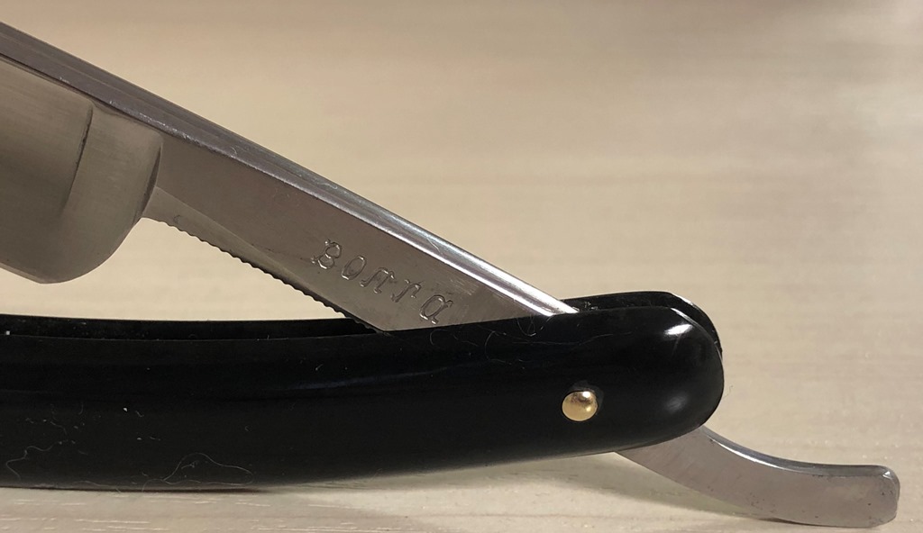 Итак,SUZUMASA 888.(寿々正 = Suzu Masa). Ширина полотна-21 мм Толщина обушка-6.3 мм Углеродистая, по всей видимости шведская сталь. Форма лезвия-фреймбэк. Время производства-50-60-е годы. Клинок имеет малозначительные и практически незаметные следы пользования. Разобрал бритву, немного почистил район осевого пина и обушок и снова собрал, сохранив родные пины. Заводская шлифовка и полировка полотна.Сталь чистая, с элементами благородной , старинной патины.Идеальная геометрия:кромочка равномерна по всей длине и еле заметна.Тяжёлая, мощная и красивая бритва будет отличным вариантом для тех, кто имеет желание попробовать подобную форму лезвия.Заточена и готова к бритью. Цена-6500 р с доставкой. Внимание! Важная информация! Spoiler Show