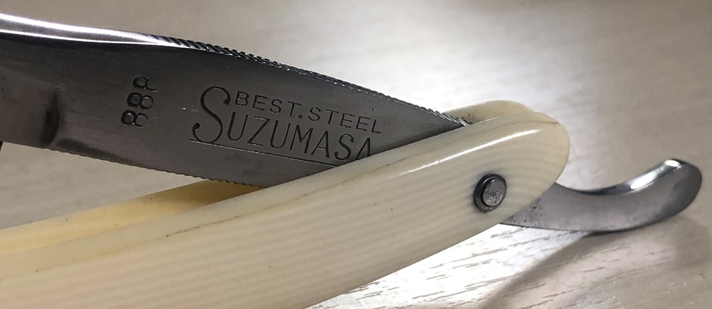 Итак,SUZUMASA 888.(寿々正 = Suzu Masa). Ширина полотна-21 мм Толщина обушка-6.3 мм Углеродистая, по всей видимости шведская сталь. Форма лезвия-фреймбэк. Время производства-50-60-е годы. Клинок имеет малозначительные и практически незаметные следы пользования. Разобрал бритву, немного почистил район осевого пина и обушок и снова собрал, сохранив родные пины. Заводская шлифовка и полировка полотна.Сталь чистая, с элементами благородной , старинной патины.Идеальная геометрия:кромочка равномерна по всей длине и еле заметна.Тяжёлая, мощная и красивая бритва будет отличным вариантом для тех, кто имеет желание попробовать подобную форму лезвия.Заточена и готова к бритью. Цена-6500 р с доставкой. Внимание! Важная информация! Spoiler Show