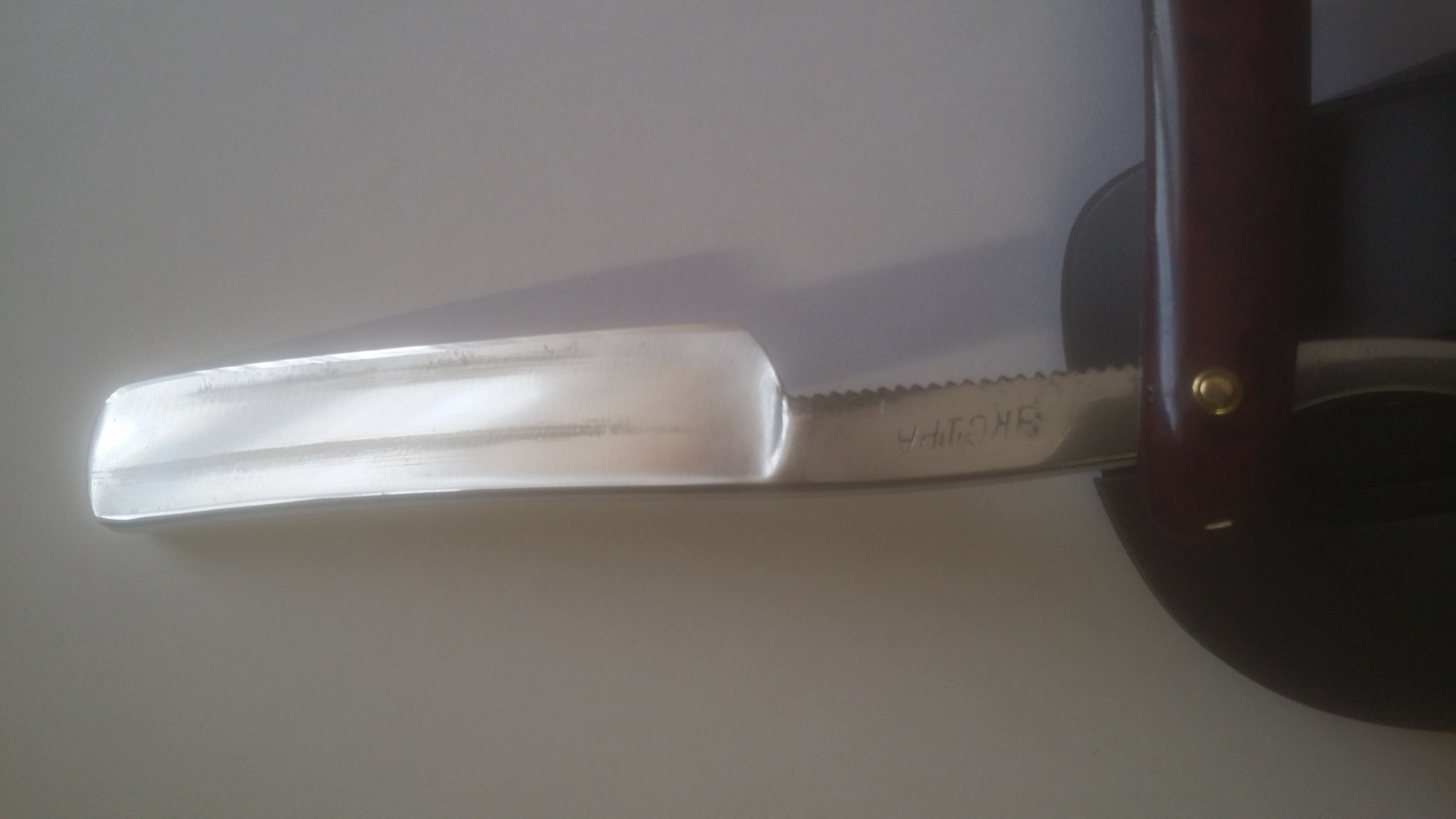 На моих фото (под спойлером) видны несколько "следов времени" на клинке, которые находятся в районе над кромкой. Вычищать до конца не стал, чтобы не испортить геометрию полотна,не убирать лишний металл, да и при правильной эксплуатации эти вещи ни на что не влияют и часто встречаются на старых бритвах.Все это сказывается на конечной стоимости бритвы.
