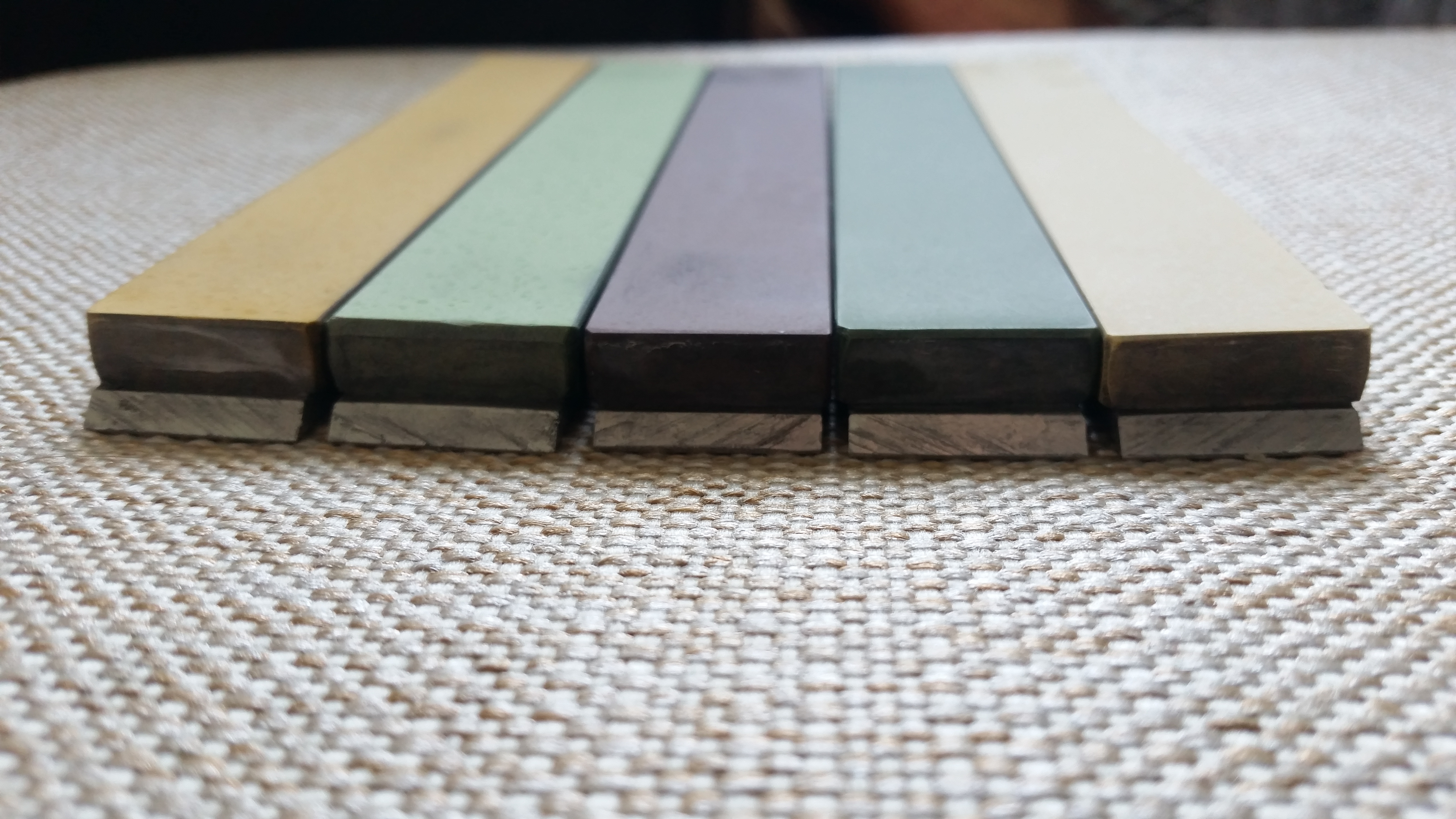 Сет японских водных камней Shapton Pro в точилку типа Apex, гритности 1000, 2000, 5000, 8000, 12000. Считаются одними из лучших японских водников, очень удачное решение в точилку - камни твердые, хорошо держат плоскость и не требуют замачивания. Камни наклеены на алюминиевые бланки, размеры камней 152х22х7 мм. Поверхности готовы, 12000 с одного края потемнее и есть мелкий скол на грани - не влияет на использование. Брал у профпродавца, очень мало б\у, практически исходное состояние. Цена всего сета - руб. Рекомендую приобрести ремень для правки опасных бритв моего изготовления из итальянской кожи (подробнее на странице 4, объявления 56-58). Spoiler Show