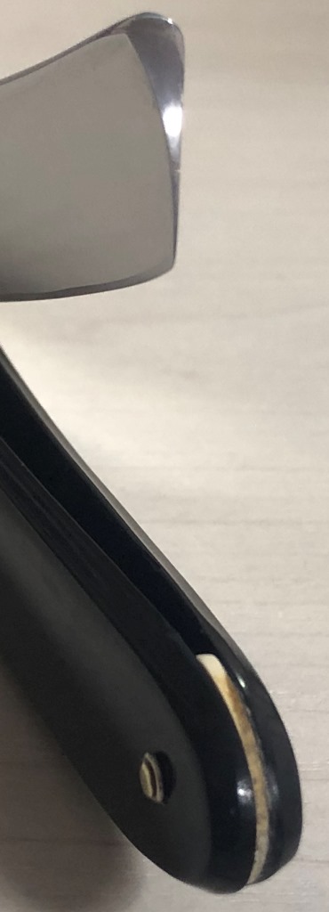 Клинок не имел следов пользования, но прошелся самым тонким абразивом, чтобы убрать патину и царапины и не испортить геометрию полотна. (еле заметное пятнашко времени, что осталось, не в счет).Взамен навсегда утраченной родной ручки я принял нестандартное решение и поставил оправу от английского донора середины 19-го века. Понятно, что японцы никогда не использовали слона на своих изделиях, но тем оригинальнее становится бритва, особенно в наше время.Плашки ручки без трещин, за одним исключением:в районе нижнего пина были просверлены рядом два отверстия(не мной, естественно).Ни на что не влияет, но упомянуть обязан.Думаю, такой косячок можно простить мастерам 19-го века.