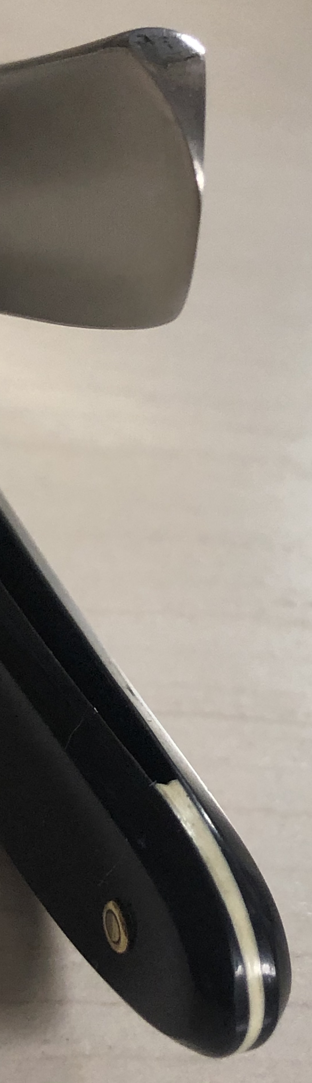 Клинок в очень хорошем состоянии.Немного исправил "обратную улыбку", почистил ,восстановил оригинальный гринд,в меру своих возможностей и отполировал.Касаемо оправы...Роговая, натуральная ручка ,древняя,от французского донора 19-го века.(Немного длинновата, конечно, но в любом случае лучше, чем какой то заводской пластик. ) Так как на оправе имелись довольно большие отверстия под пины, то мною было принято решение поставить именно такие шайбы, возможно крупные,зато надёжные.Сталь чистая, без видимых дефектов. Идеальная геометрия клинка:кромочка равномерна по всей длине.Бритва получилась немного тяжелее, по сравнению с бритвой в оригинальном исполнении.В любом случае,бритва приятна во всех отношениях. Брить должна неплохо. Заточена и готова к бритью.