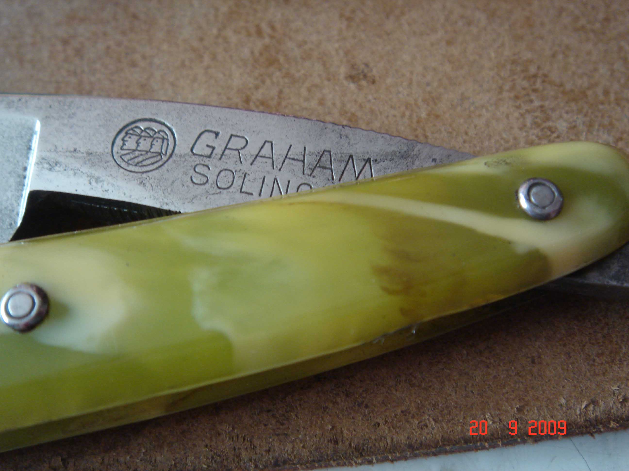 Купил на блошином рынке сегодня замечательно острую бритву. Торговая марка Graham - логотип три головы в касках.На нашем сайте не нашел никакой информации по этой марке. Может кто знает что нибудь о ней? И еще есть маленкая зазубрина - около 0,1мм. Можно ли без камней в домашних условиях её вывести, либо надо отдавать на ремонт? А надо ли - вроде не мешает? Спасибо!