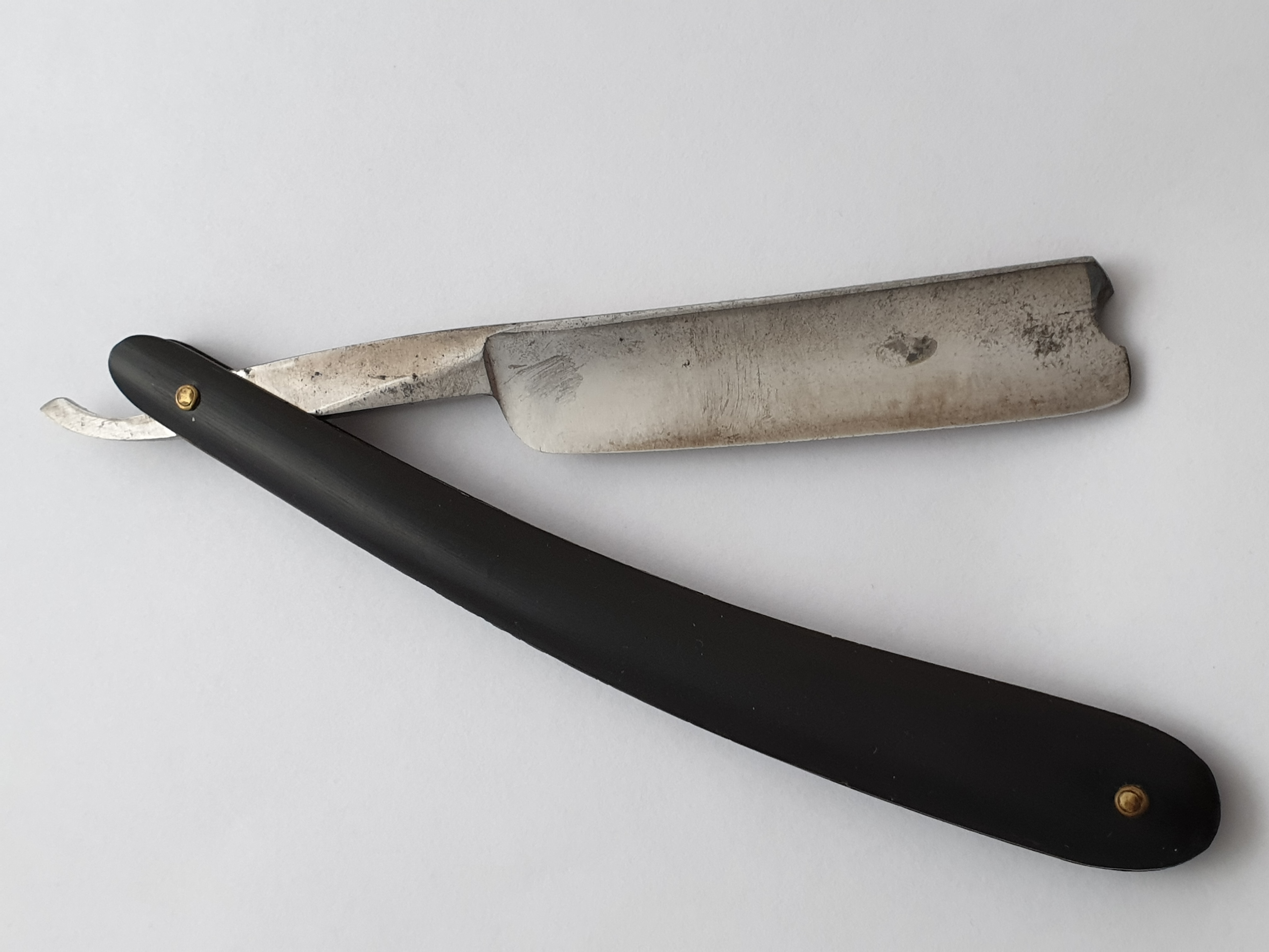 Продаётся от S&T67. Винтажный французский бесхвостый клин, под восстановление. От клейма остались полунамеки на пару букв. Ширина клинка 16мм. Ручка из рога, в весьма хорошем сохране, крепкая, пины - железо, с внешними шайбами типа "бычий глаз". Мелкая насечка на эрле с обеих сторон. Все родное, бритва не разбиралась, клинок паркуется в ручку по центру, без перекосов.