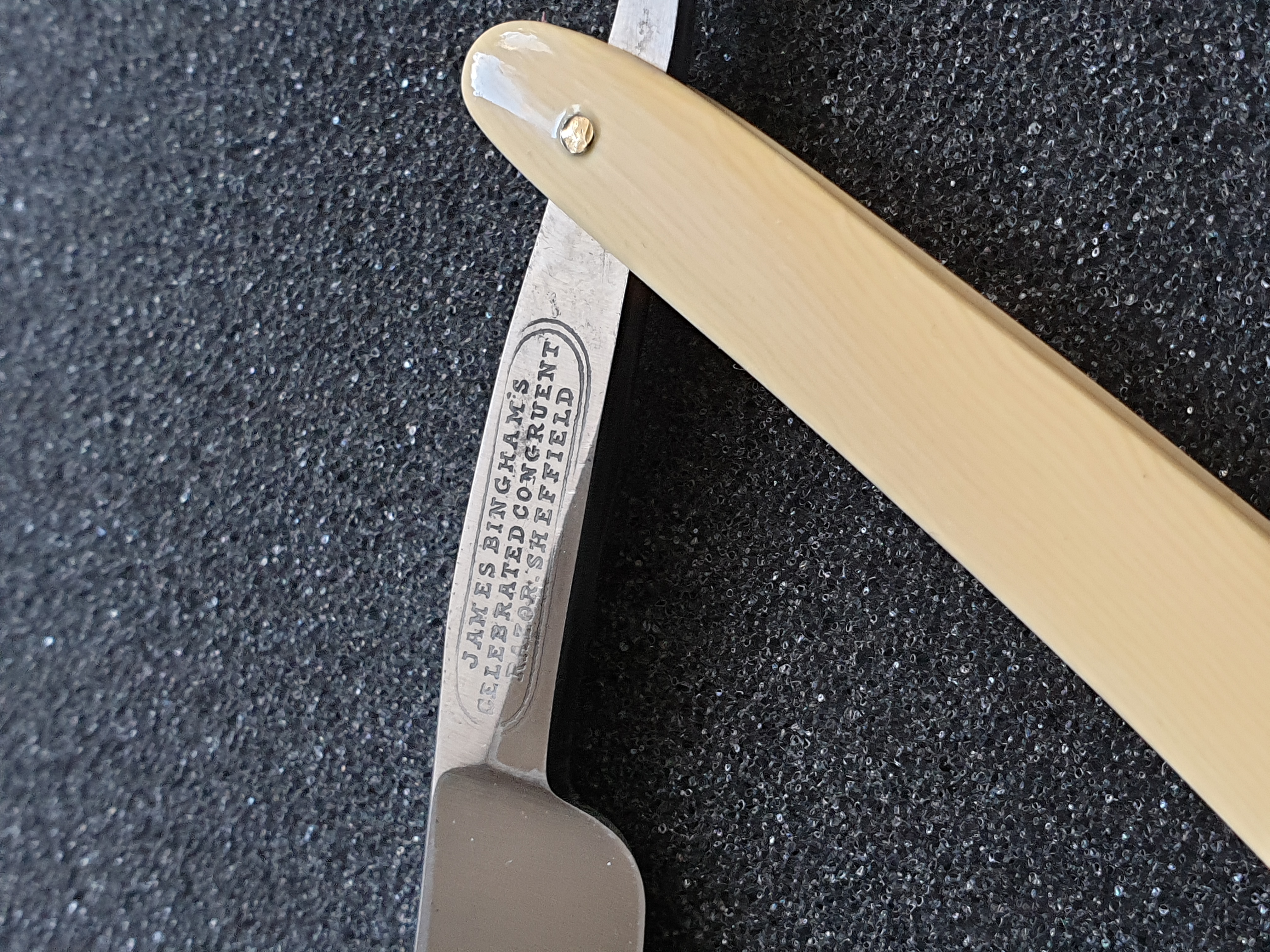 Продаётся от S&T66. James Bingham's Celebrated Congruent Razor, Шеффилд. По данным из Tweedale's Directory of Sheffield Cutlery Manufacturers этот весьма старинный бритвенный производитель работал в небольшом промежутке времени, с конца 1820-х до 1845 года. Причем был не на задворках - начинал как партнер Jonathan Crookes, а в итоге его марка отошла Wostenholm.