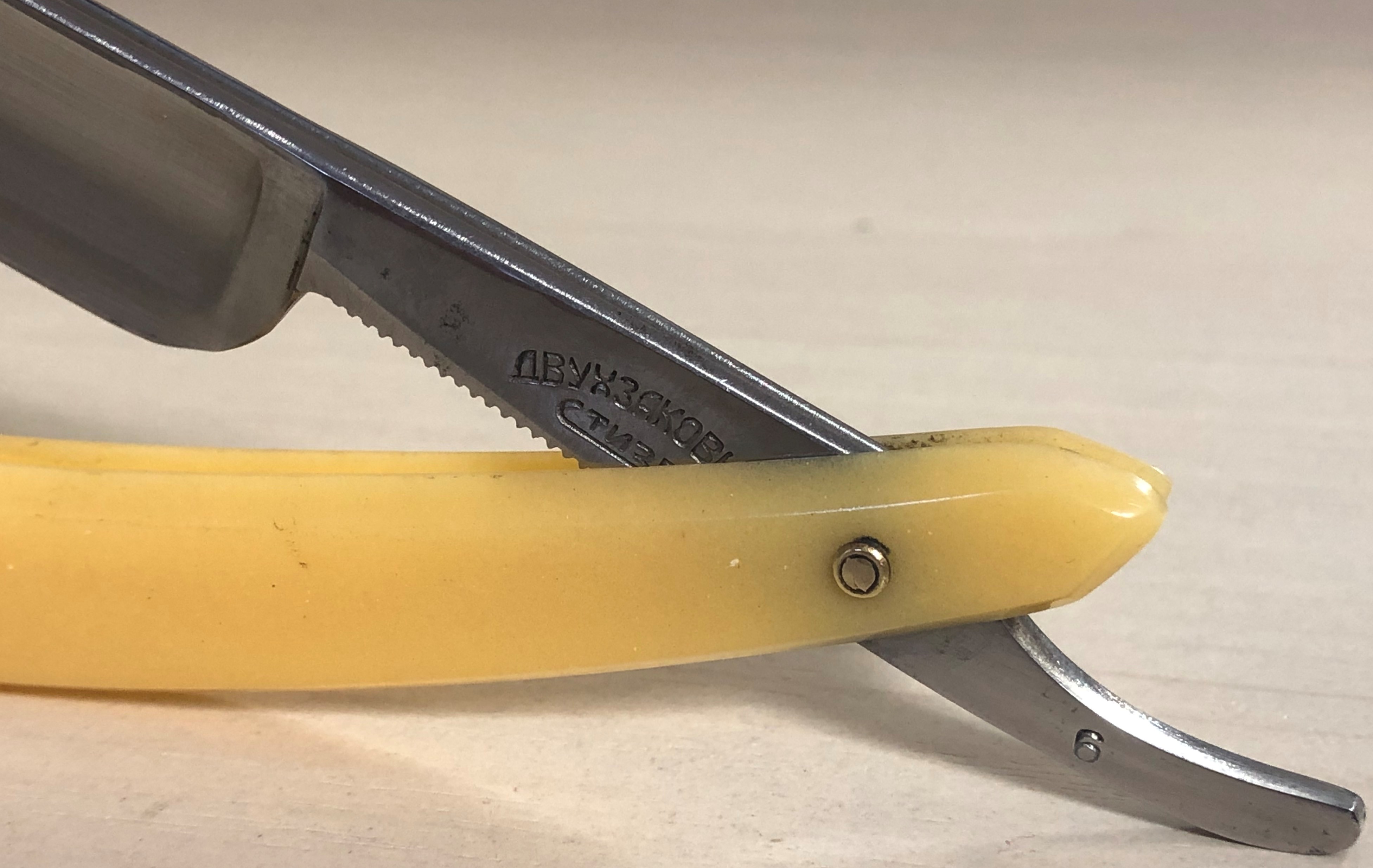 Малопользованная, либо вообще не была в деле.Бритву разобрал, немного почистил и отполировал клинок и снова собрал, сохранив оригинальный пин.