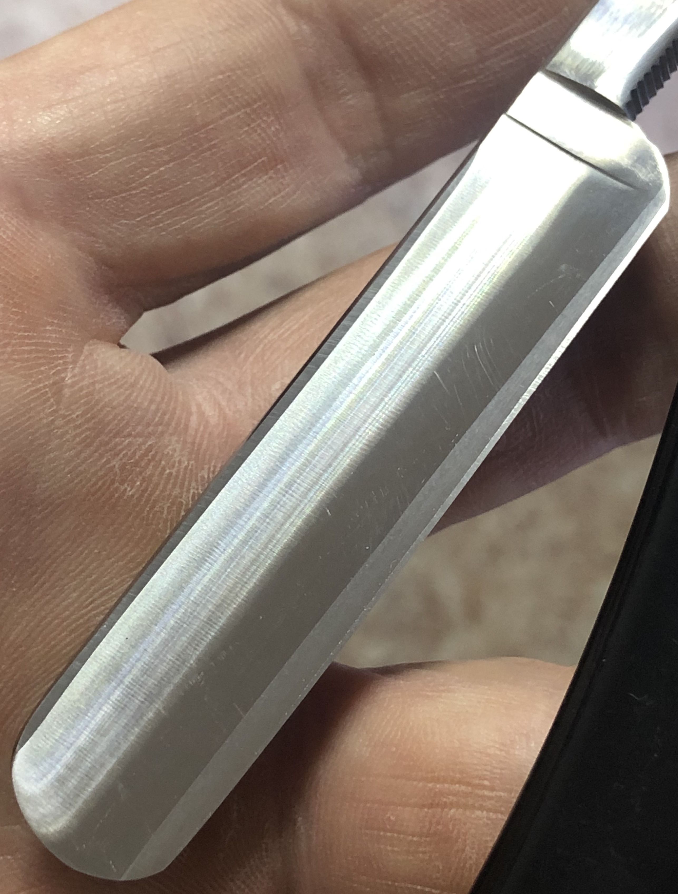 Идеальная геометрия клинка:кромочка равномерна по всей длине и еле заметна. Отличная "звонкая" сталь способна выдавать мягкое и чистое бритьё.Заточена и готова к бритью.