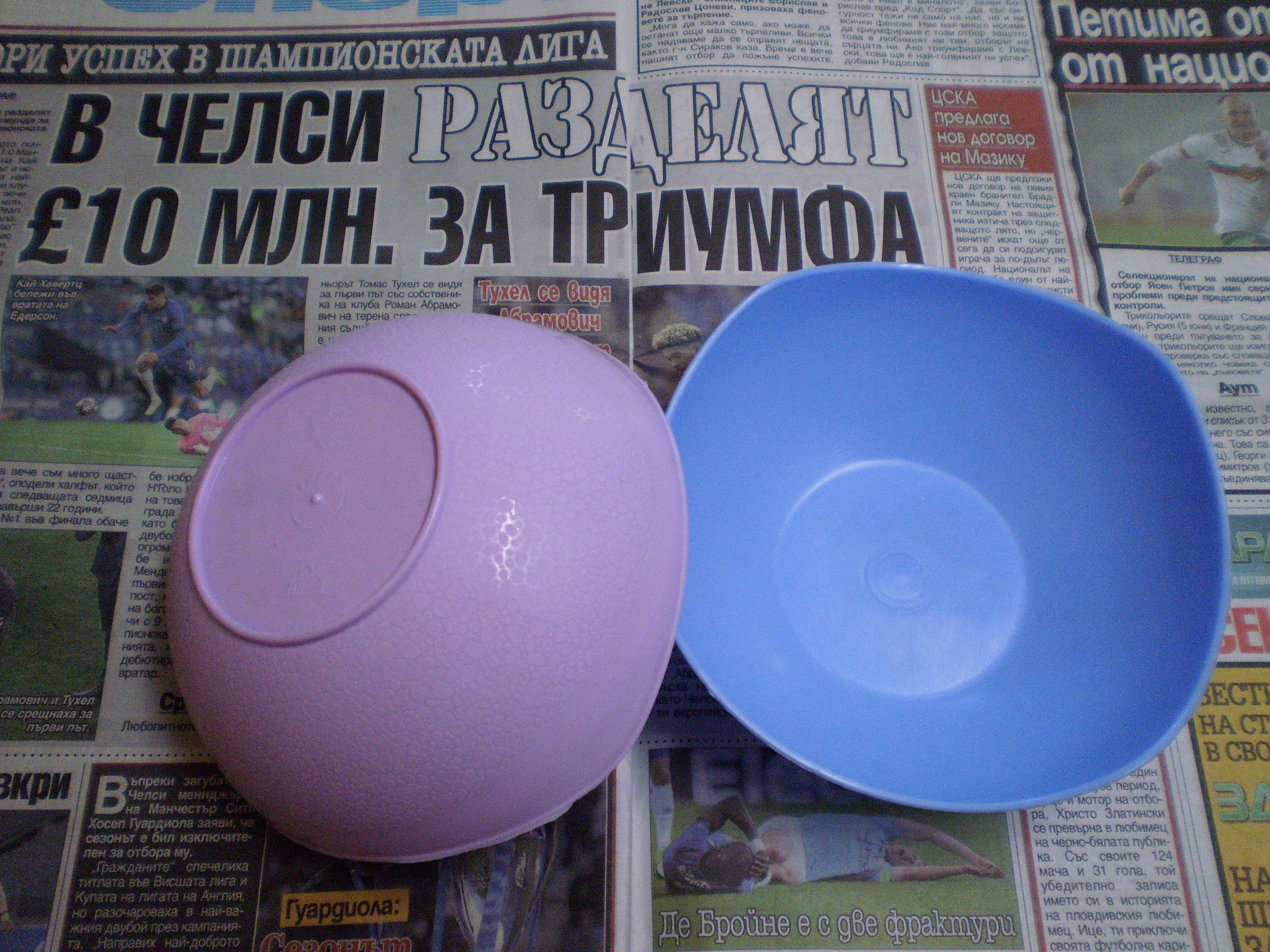 Сначало подчеркну, что внешний вид, материал и цвет меня совершенно не интересуют! Для меня главное качество кружка для бритья - это удобство! До этого я использовал фарфоровой чашки (слишком громоздкая, помазок из борсука) или миски для кошачего корма (слишком низкая, помазок из кабана). Несколько месяцев назад решил сделать чего-то более удобного. За копейки купил двух мисок из пищевого пластика. Высота - ок. 60 мм., ширина - 140 мм. Они тонкие и гибкие, поэтому я их приклеил друг к другу. В результате получилась крепкая двухстенная кружка с термоизолирующим эффектом. Весь - 68 грамм. Не бьется и не ломается - случайно пробовал несколько раз. Воду нагреваю в микроволновке. Подробно покажу. Внешний вид мисок: Перед приклеиванием подготовил поверхностей наждачной бумаги: Просверлил отверстие диаметром 1,5 мм в нижней миски: После приклеивания надо прижать и подождать несколько часов: Вот как выглядит с помазком из синтетики: Я очень доволен. Вот как работает: