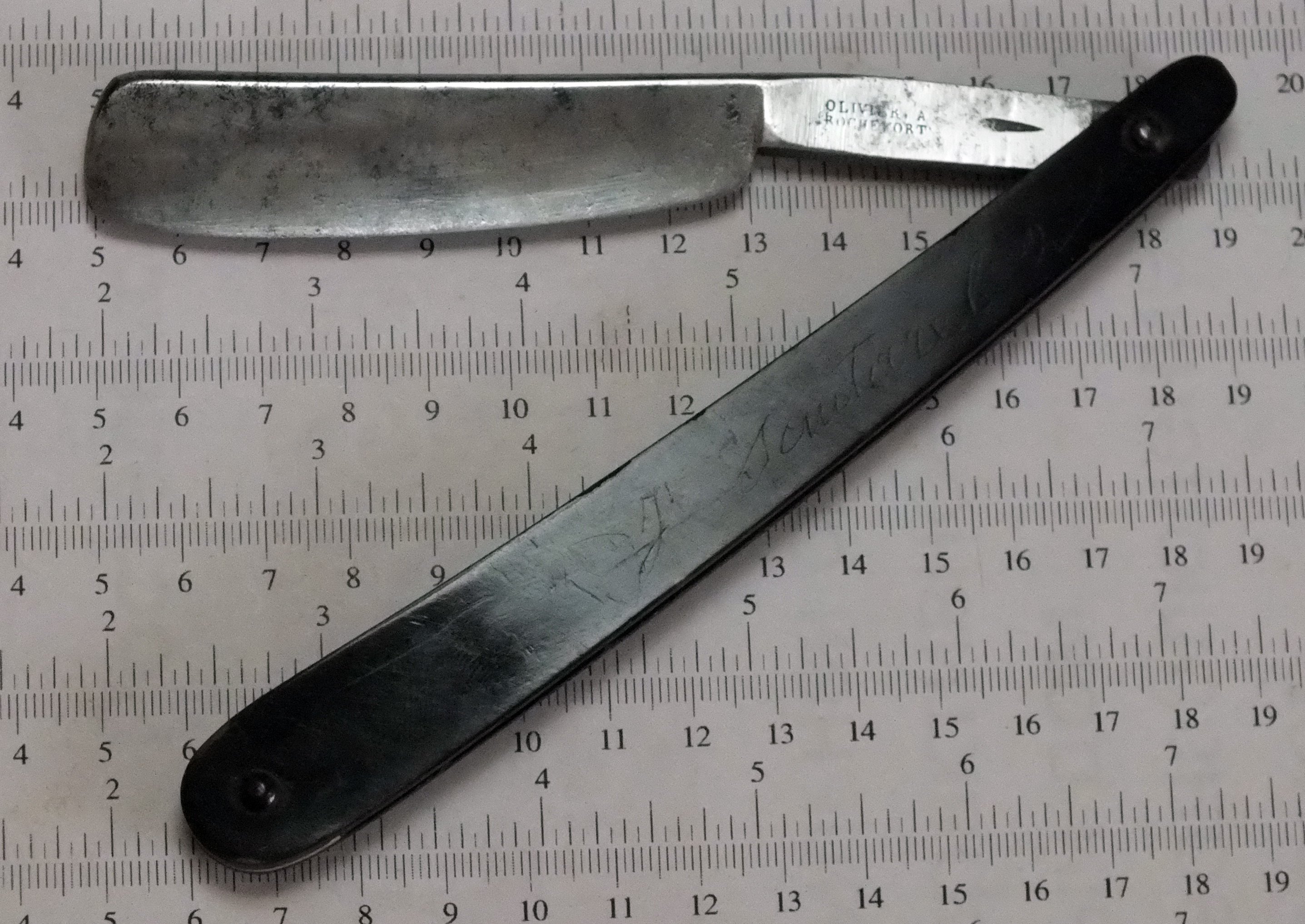 В такой ситуации нельзя поставить заклепку, просто ручка потрескается, потому что под ней нет твердой опоры. Чтобы получить ровную поверхность, пришлось бы стереть всех надписей, но я этого не хотел, поэтому шлифовал металл толко на узких участках ерла – шириной чуть больше 10 мм. На этих участках поставлю внутренних шайб из нержавеющей стали толщиной в 0,45 мм. Так как после очистки от ржавчиный диаметр осевого отверстия увеличился на 2,6 мм, впритык просверлил новое отверстие диаметром 1,8 мм для осевой заклепки. В старом отверстии поставил кусочек ненужного винтика и приклеил епоксидкой. Вот как выглядит ерл после такой обработки: Узкие участки ерла шлифуются при помощи куска стали (размер 10х10х100мм), на котором приклеивается наждачная бумага. И начал шлифовать, ех раз, да еще раз, да еще много-много раз ... В общем, участки „утонули” на около 0,20 мм ниже поверхности ерла. После заклепывания, зазор между ерлом и ручки сохранился. На фото это хорошо видно: В дальнейшем поставил ручку от „погибшей” немки и Волга обрела вторую счастливую жизнь. Я таких вещей (шлифование узких участках ерла) проделывал несколько раз и всегда с отличным результатом. Вот бритва после вышеописанной операции: С 2013 г. с кайфом бреюсь опасной бритвой пять раз в неделю, в три прохода.