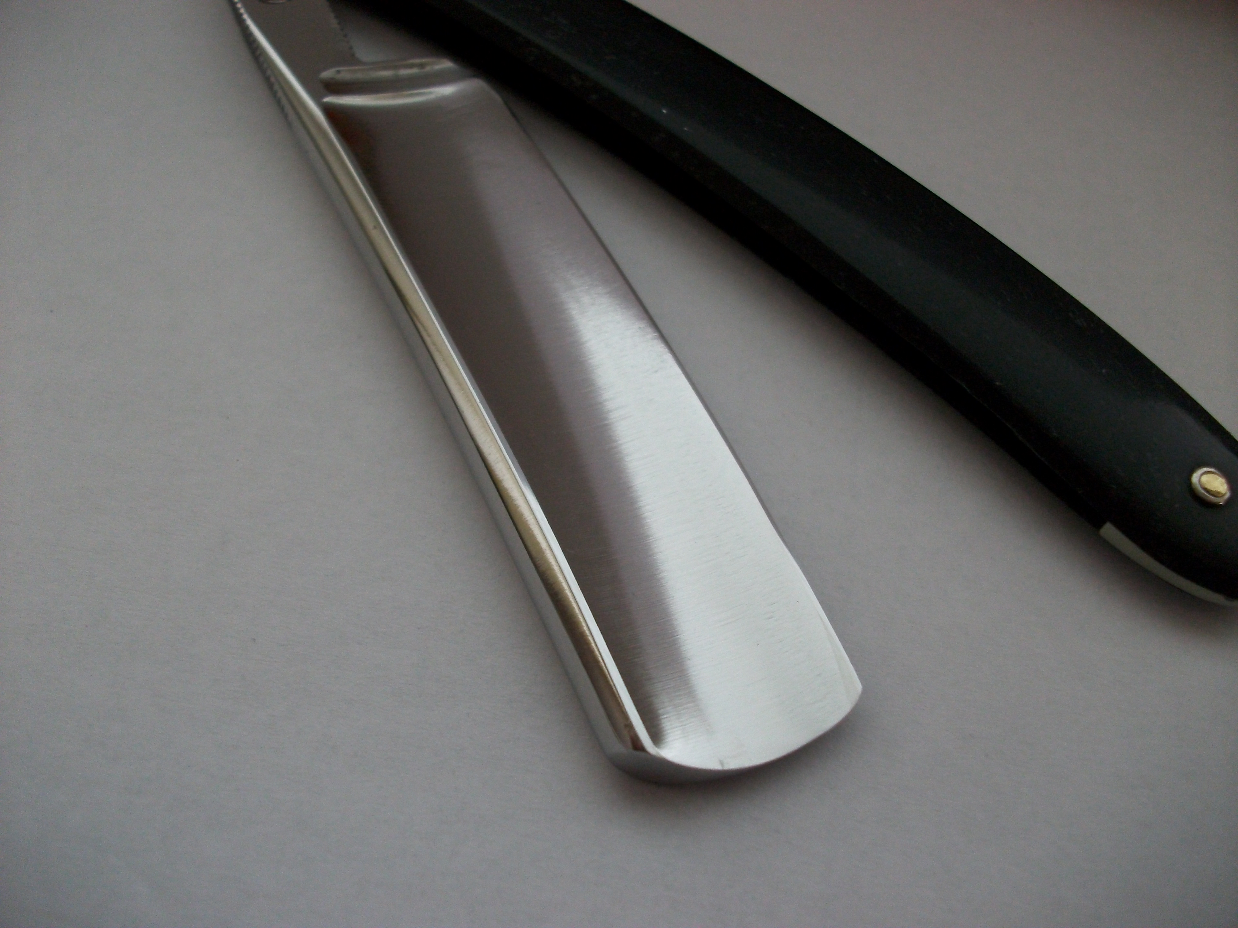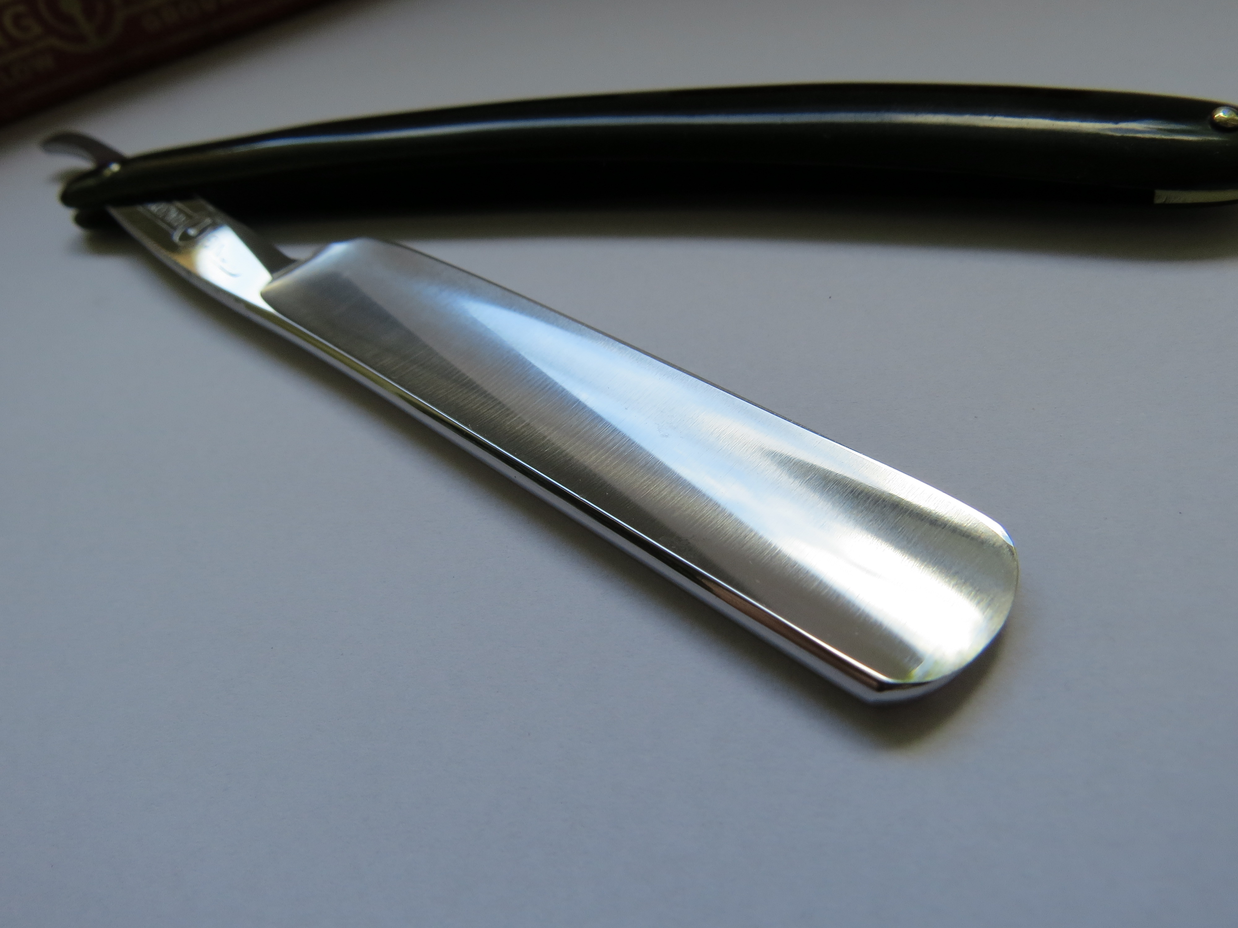 Бритва с длительного хранения (незначительные следы остались) и по моему мнению не была в использовании. Немного освежил и заточил. углеродистая сталь, ширина полотна 16мм, длина режущей кромки примерно 70 мм. В комплекте родной бокс.