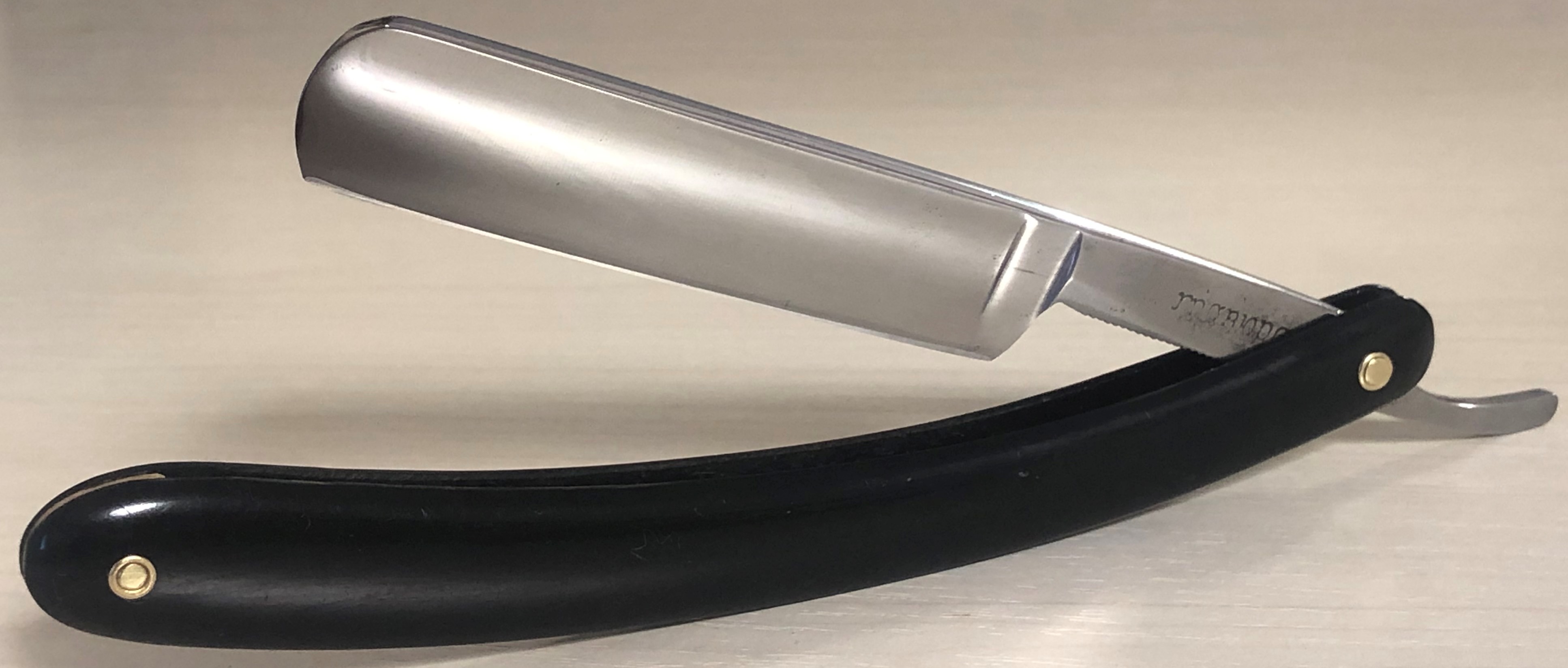 Ширина полотна-20 мм Толщина обушка-6.5 мм Углеродистая сталь. Форма лезвия-1/2 клин Примерно 50-60-е годы . Весьма приятная бритва во всех отношениях. Разобрал,почистил, отполировал и снова собрал, заменив пины на немецкие втулки.Снова не стал идти легким путем и шлифовал клинок на камнях, вручную.Долго, муторно, но получаешь удовольствие от процесса, заодно всегда можно проконтролировать то, что делаешь , чтобы не убрать лишнего и не перегреть с дуру металл..Ясное дело, что задачи не стояло получить идеальное зеркало, как это можно увидеть на множестве новодельных бритв:заплывшее от полироли зеркало. Тут скорее умеренный, легкий продольный сатин, хотя под другим углом ,если смотреть, то отражение очень хорошее.Приятный голубоватый оттенок от ручной шлифовки и полировки. Короче, достаточно красивая, практичная, удобная и недорогая бритва. Сталь не имеет визуальных дефектов, геометрия на уровне.Не пропустите рабочий инструмент за вменяемые деньги. Заточена и готова к бритью. Цена-6500 р с доставкой.ПРОДАН Внимание! Важная информация! Spoiler Show