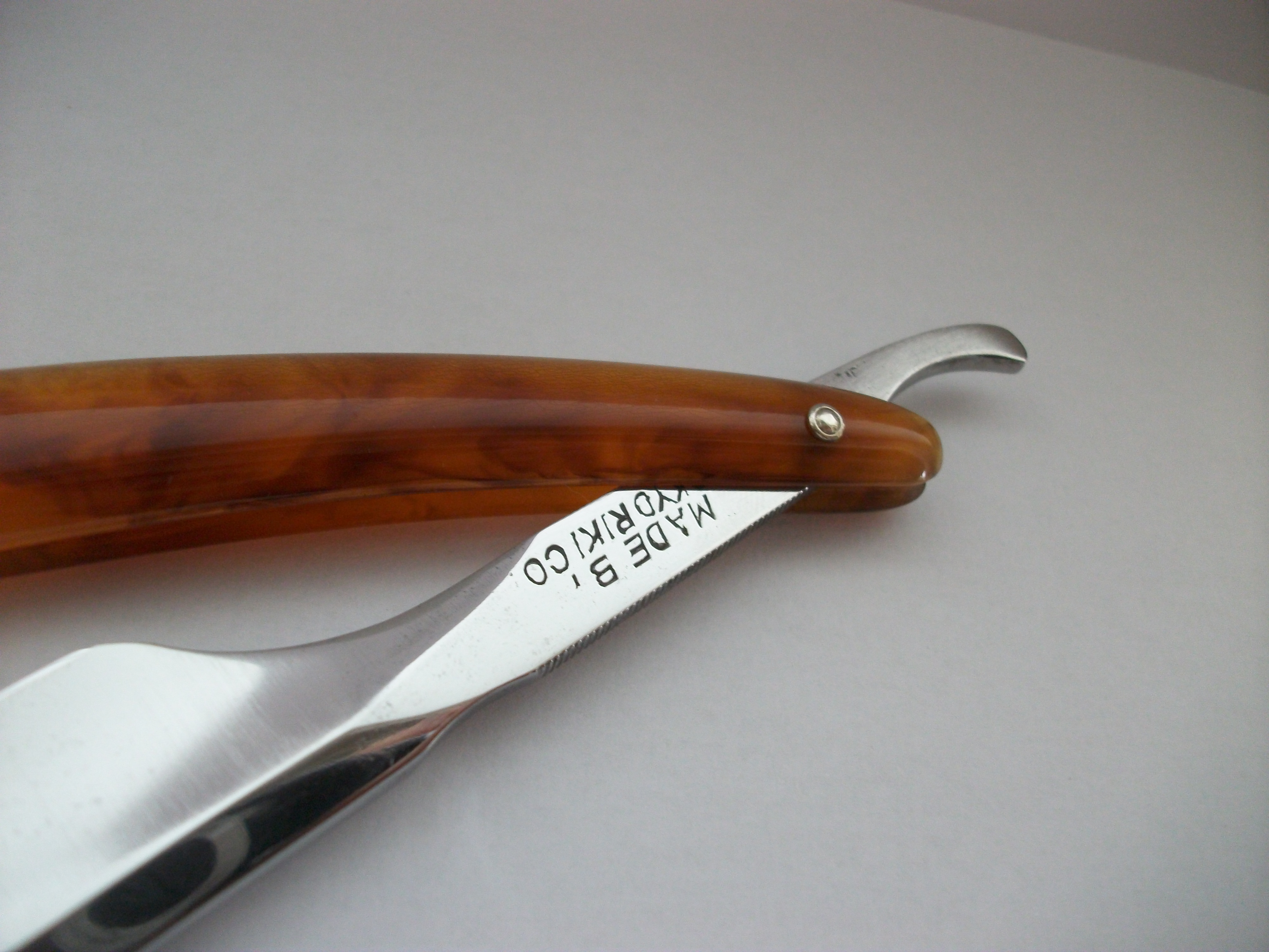 Ширина полотна 20мм, длина режущей кромки 70мм, нержавеющая сталь Frozen-steel (так полагаю закалка с применением отрицательных температур. Ручка классическая Пумовская, 3 пина, непонятные номера у осевого пина. Заточена и готова к бритью. Продано. Spoiler Show
