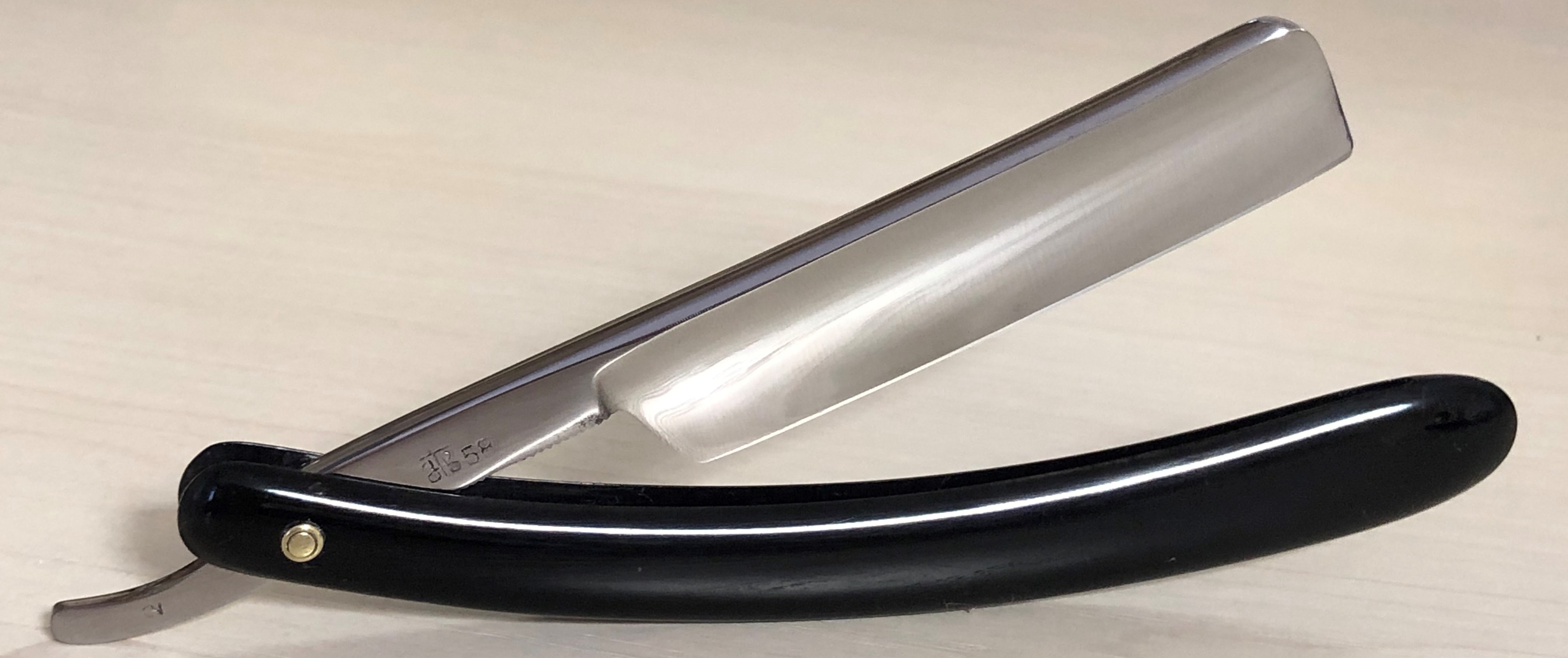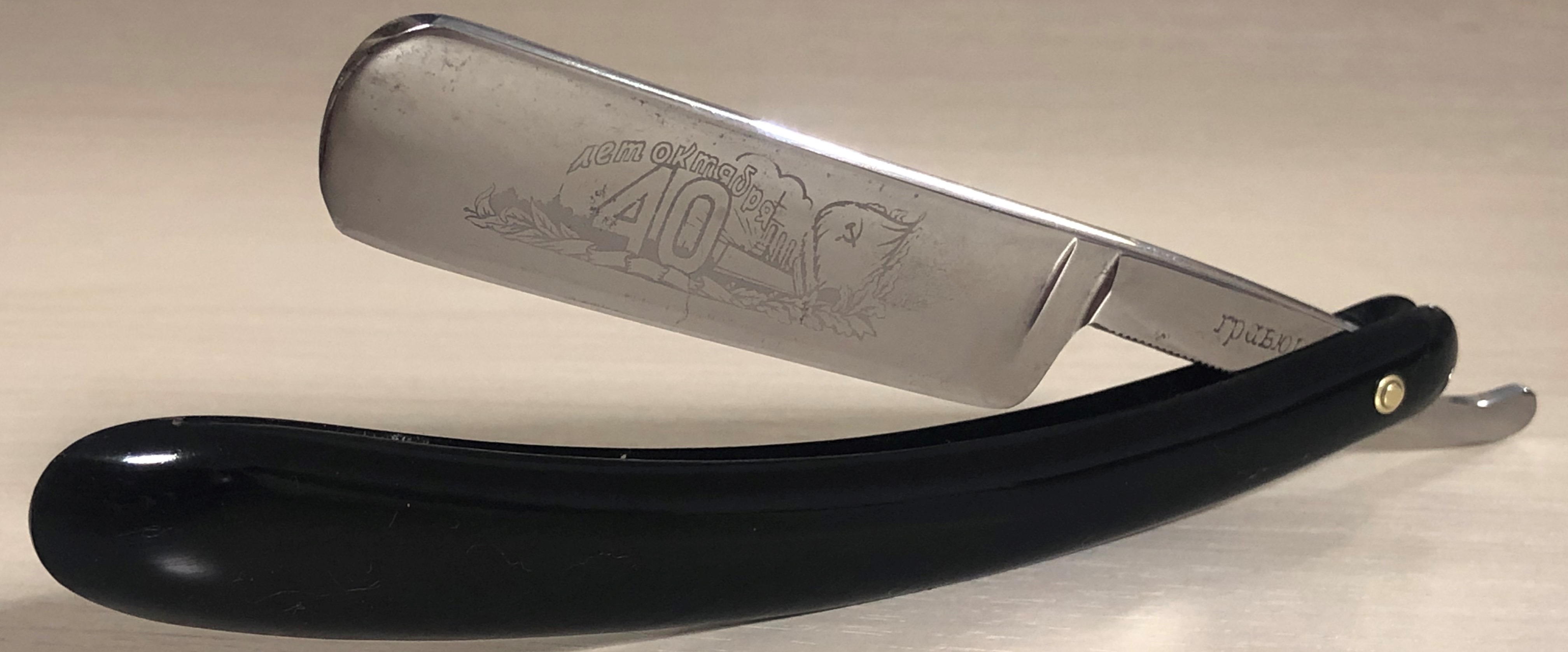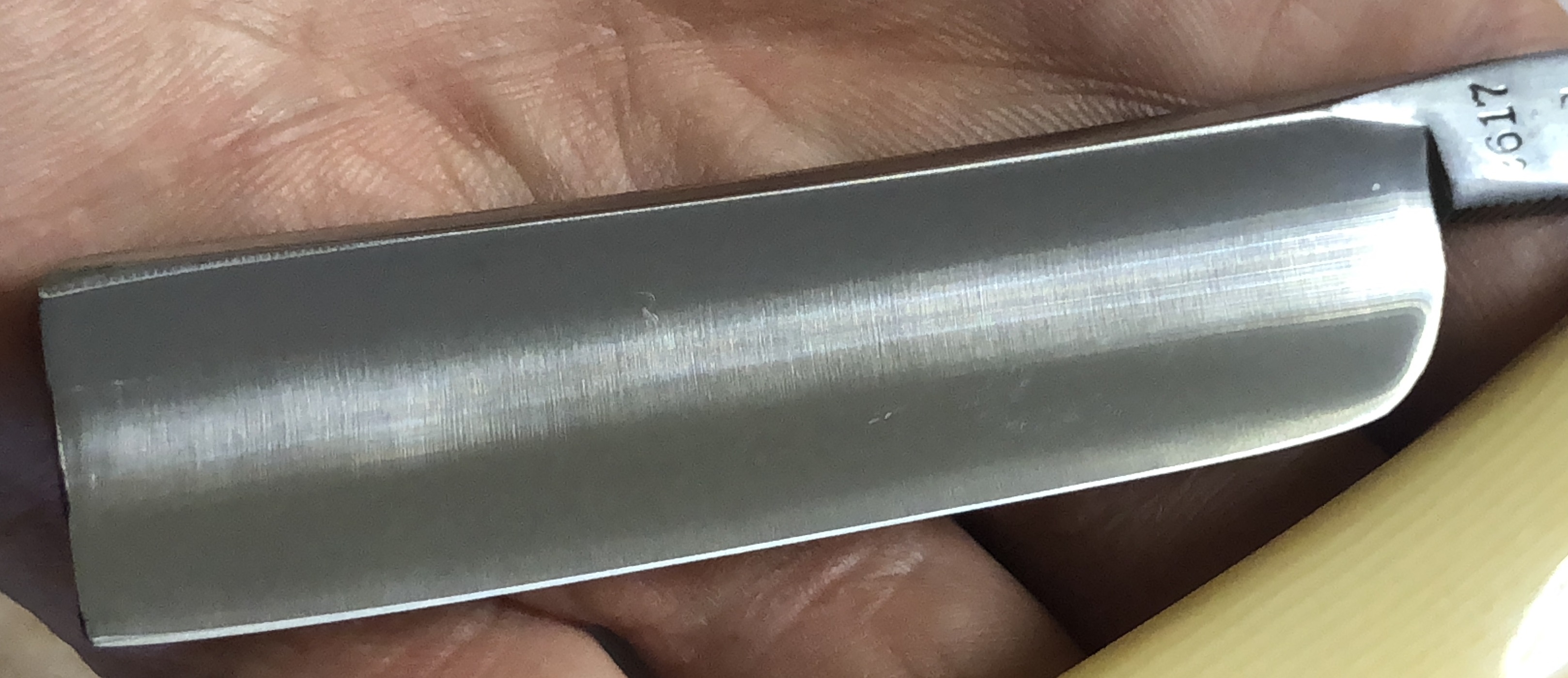 Ширина полотна-20 мм Толщина обушка-6.5 мм Углеродистая сталь. Форма лезвия-1/2 клин Примерно 50-60-е годы . Весьма приятная бритва во всех отношениях. Разобрал,почистил, отполировал и снова собрал, заменив пины на немецкие втулки.Снова не стал идти легким путем и шлифовал клинок на камнях, вручную.Долго, муторно, но получаешь удовольствие от процесса, заодно всегда можно проконтролировать то, что делаешь , чтобы не убрать лишнего и не перегреть с дуру металл..Ясное дело, что задачи не стояло получить идеальное зеркало, как это можно увидеть на множестве новодельных бритв:заплывшее от полироли зеркало. Тут скорее умеренный, легкий продольный сатин, хотя под другим углом ,если смотреть, то отражение очень хорошее.Приятный голубоватый оттенок от ручной шлифовки и полировки. Короче, достаточно красивая, практичная, удобная и недорогая бритва. Сталь не имеет визуальных дефектов, геометрия на уровне.Не пропустите рабочий инструмент за вменяемые деньги. Заточена и готова к бритью. Цена-6500 р с доставкой.ПРОДАН Внимание! Важная информация! Spoiler Show