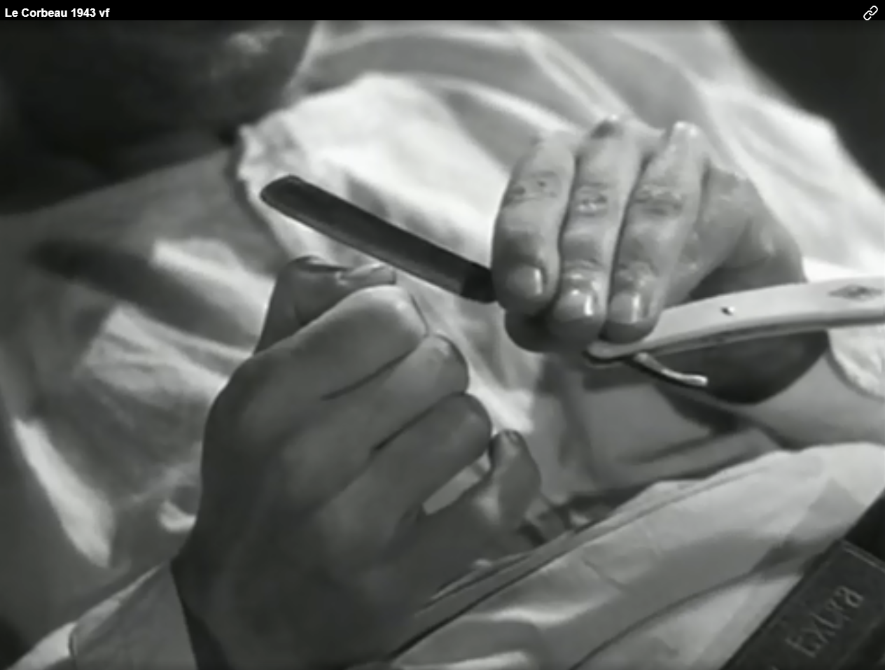 Ворон (фр. Le Corbeau) 1943 Франция Режиссёр: Анри-Жорж Клузо В ролях: Пьер Френе, Жинетт Леклер, Мишлен Френси и др. ссылка с привязкой ко времени: https://ok.ru/video/194558233176?fromTime=383 О сцене: В больницу к раковобольному Франсоа, приходит мама и приносит ему опасную бритву. Его лицо засияло, он дрожащими руками открывает ее и пробует ногтем остроту. Сцена тяжелая, но она важна тем, что в ней режиссёр показал как в эти годы проводили тест на остроту опасной бритвы. Полагаю, поэтому Олег Бритва „охотился” за этим фильмом. С 2013 г. с кайфом бреюсь опасной бритвой пять раз в неделю, в три прохода.