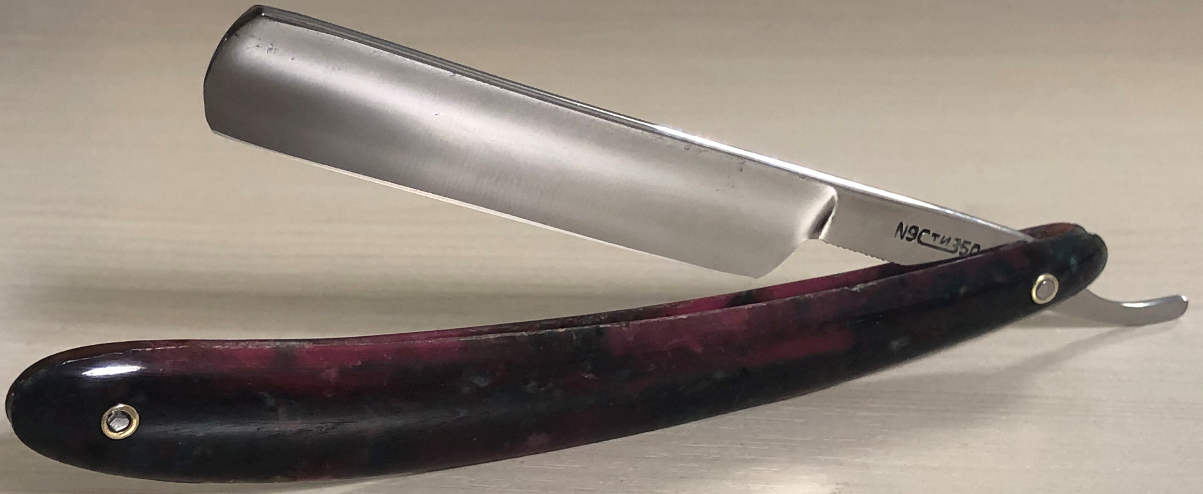 Одна из самых элегантных стизовских моделей прошлого. В пользовании не была!(Фото бритвы До работ есть).Бритва была разобрана, освежено полотно от 70-ти летней старины и снова собрана, с заменой родных пинов на немецкие втулки, с добавлением внутренних шайб, для улучшения осевого механизма.Клинок имеет идеальную геометрию, в виде еле заметной и равномерной кромочки.
