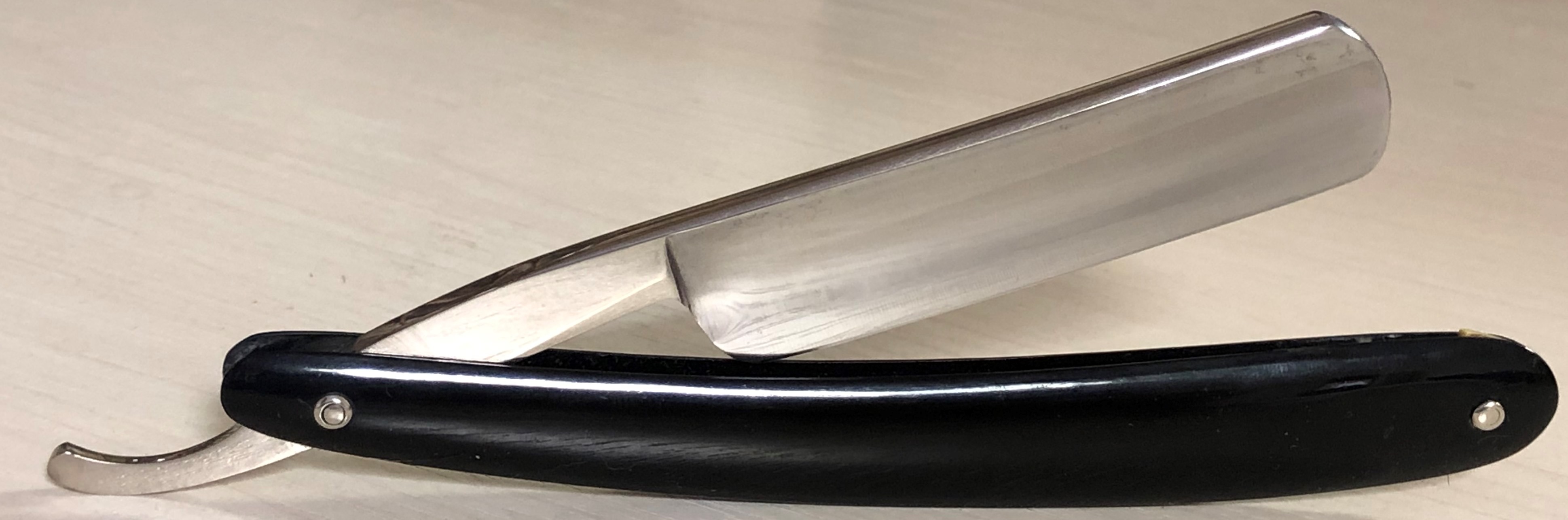 Бритва в состоянии близком к идеальному. Следов пользования не обнаружил.Разобрал, немного освежил металл на тонких абразивах, отполировал и снова собрал, сохранив родной пин.Кромочка равномерна по всей длине и практически незаметна.Сталь чистая,без видимых дефектов.Тяжёлая бритва,с элегантной формой клинка,с прекрасной"звонкой" сталью и мягким бритьём, будет очень неплохим вариантом для большинства заинтересованных товарищей.Заточена и готова к бритью.