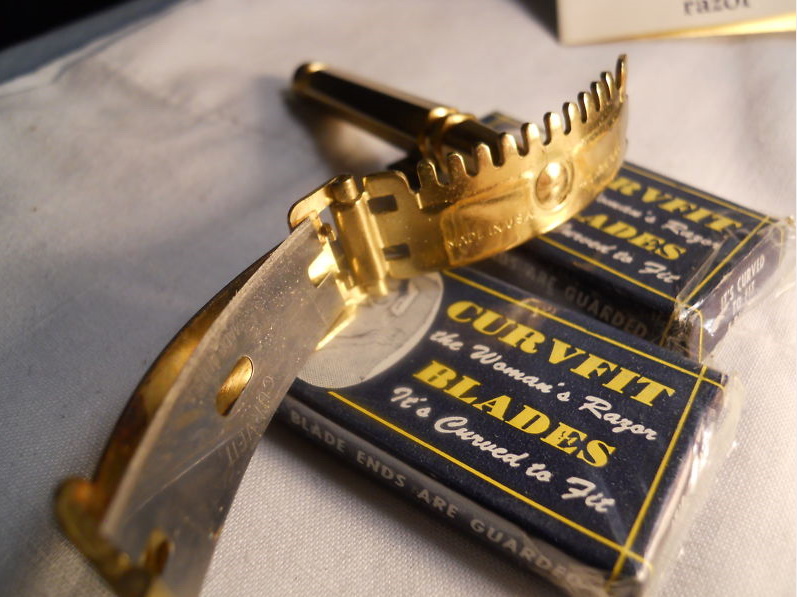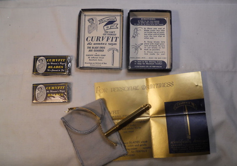 Curvfit-Безопасная бритва для Леди. Старинная позолоченная безопасная бритва для леди. Используется специальное одностороннее лезвие. Первоначальной выпуск в 1920-ых годах. Curvfit Sales Corp., 33 Джефферсон-Стрит, Стамфорд, Коннектикут.