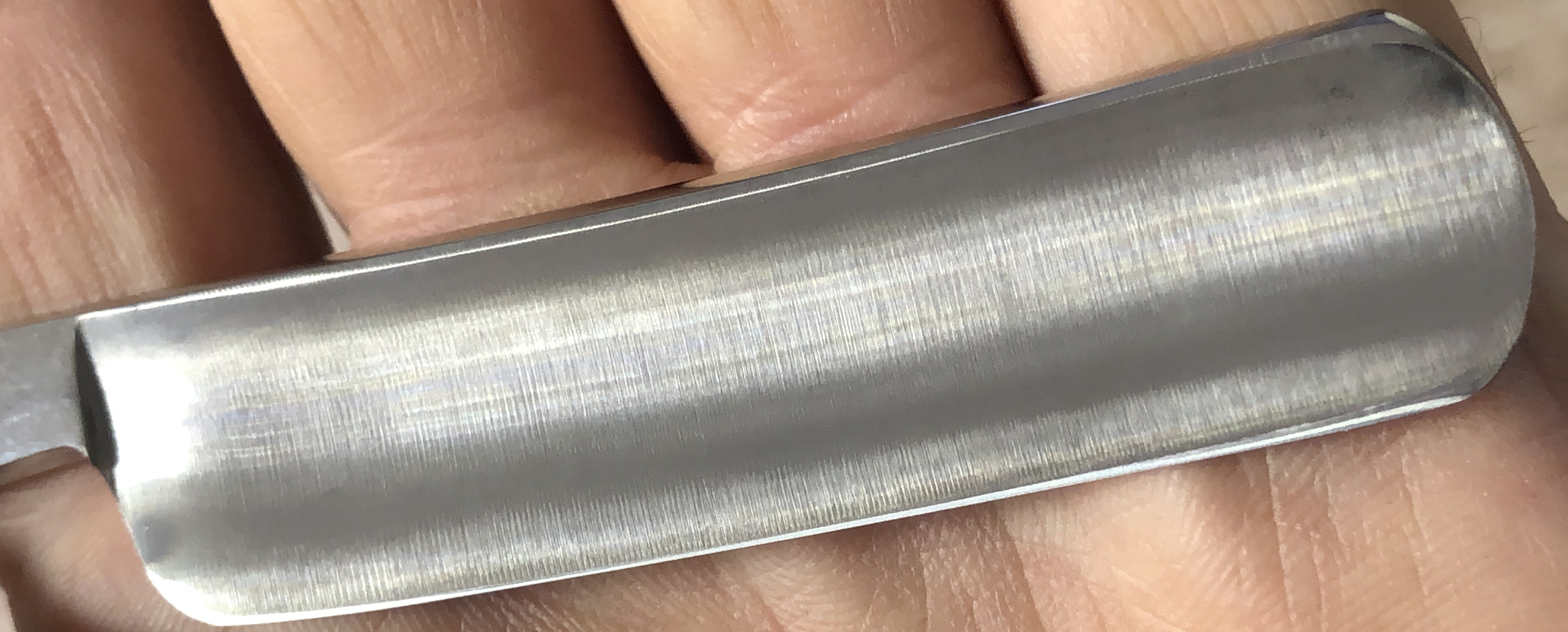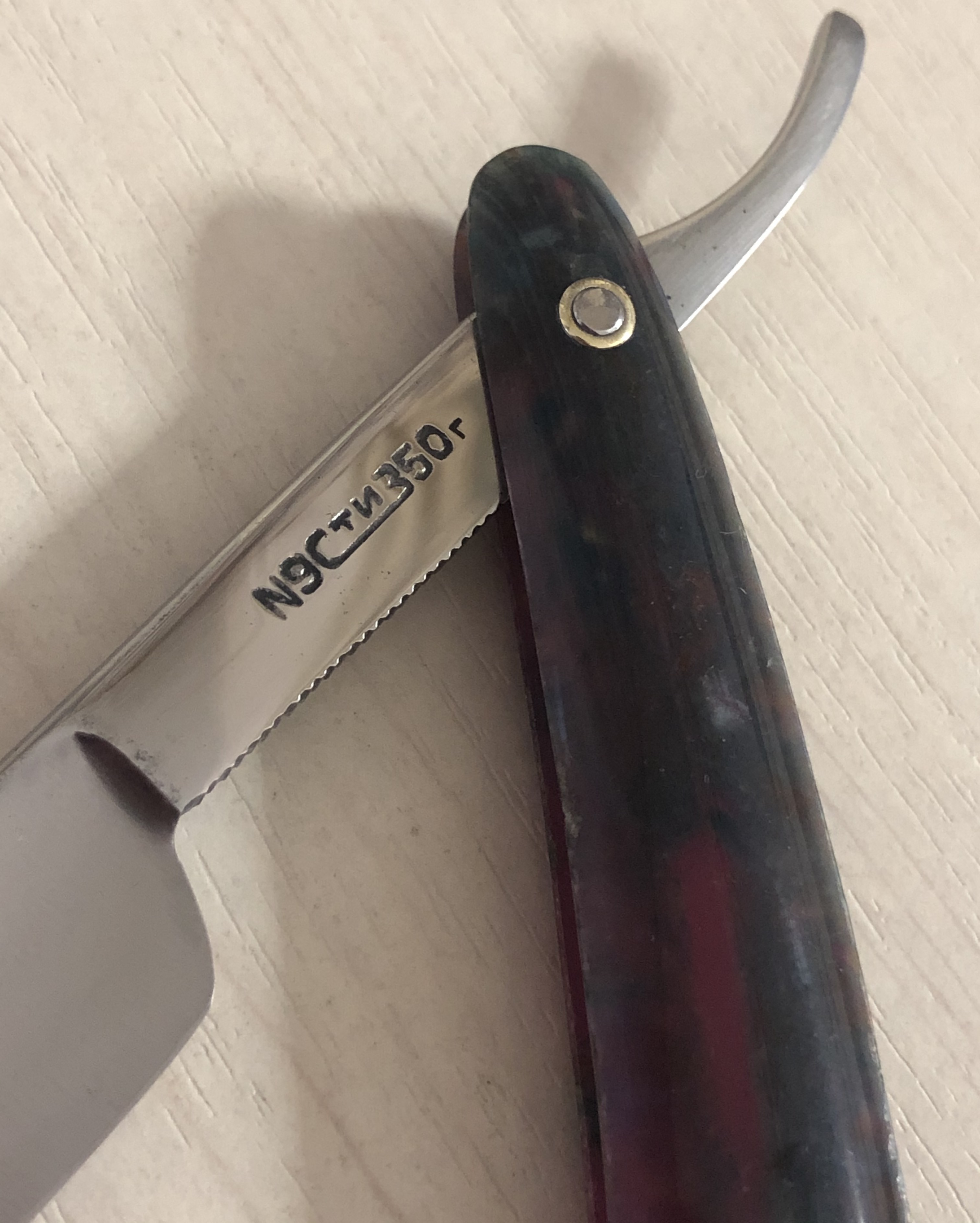 Бритва в состоянии близком к идеальному. Следов пользования не обнаружил.Разобрал, немного освежил металл на тонких абразивах, отполировал и снова собрал, сохранив родной пин.Кромочка равномерна по всей длине и практически незаметна.Сталь чистая,без видимых дефектов.Тяжёлая бритва,с элегантной формой клинка,с прекрасной"звонкой" сталью и мягким бритьём, будет очень неплохим вариантом для большинства заинтересованных товарищей.Заточена и готова к бритью.