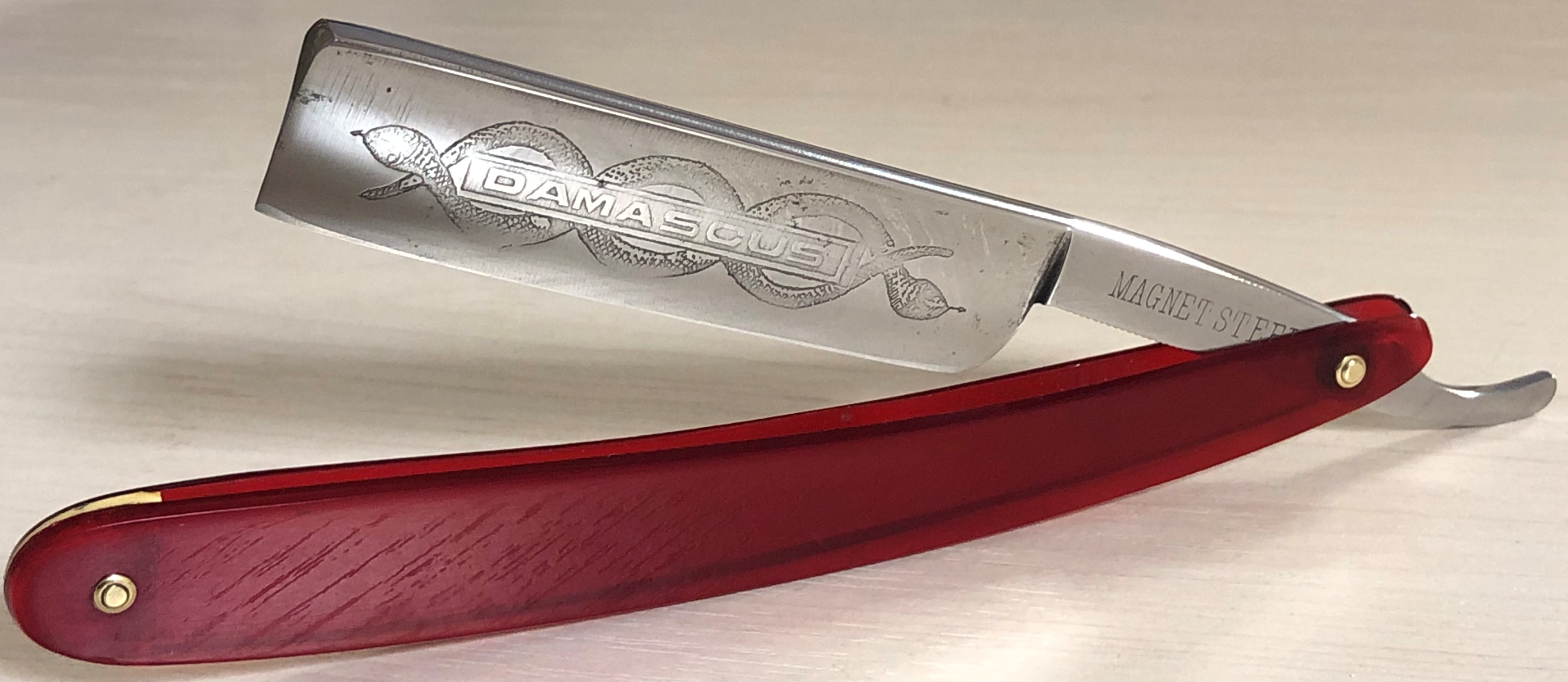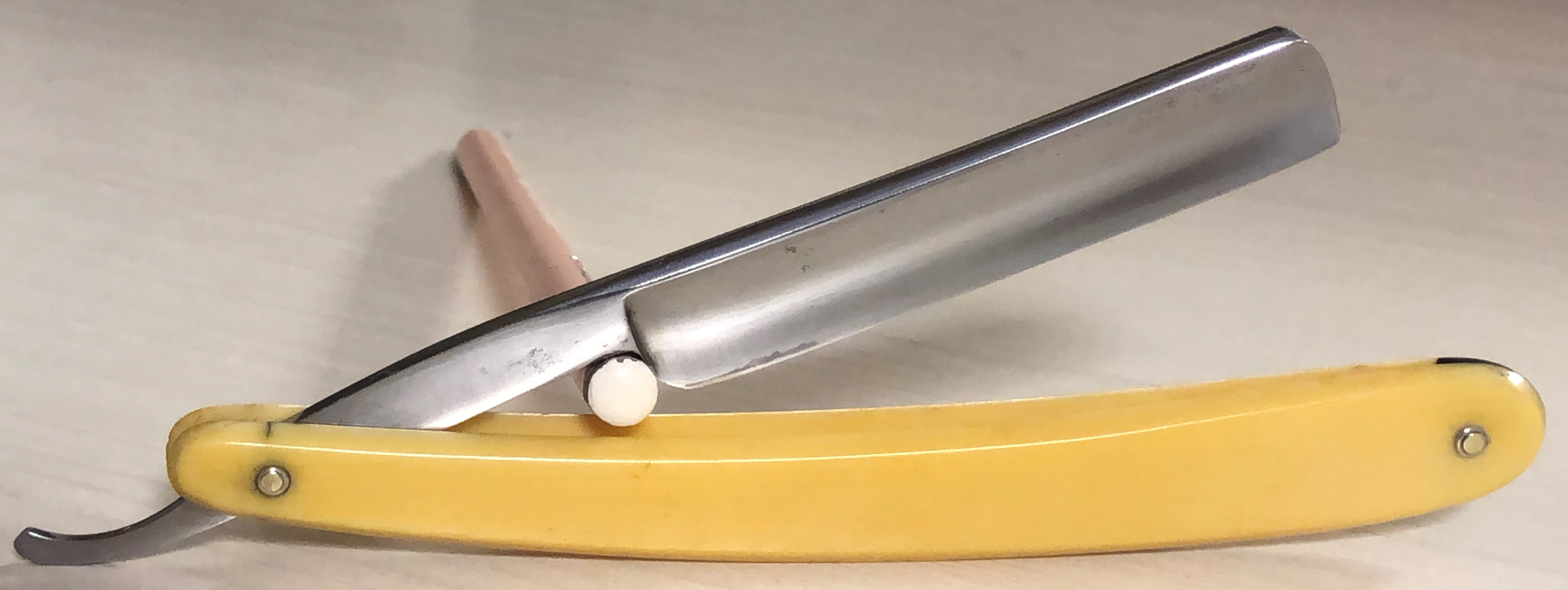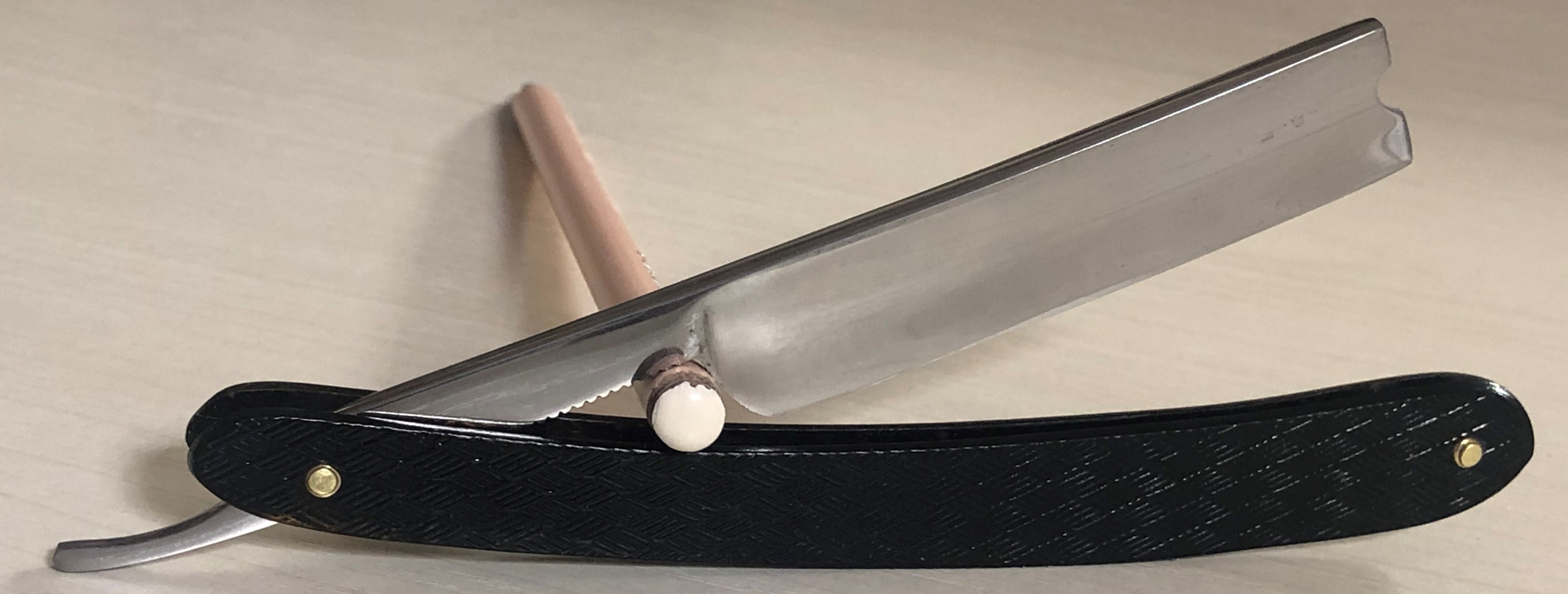 Бритва в очень хорошем состоянии для своих лет. Разобрал, немного освежил металл и снова собрал.Следов активного пользования и уточки клинка не замечено. Родную оправу не стал менять из за небольшой трещинки, которую намертво проклеил и зашлифовал.Кромочка равномерна по всей длине. Сталь чистая от разного рода видимых дефектов. Очень удобная и приятная бритва, во всех отношениях. Будет идеальным вариантом для новичка и просто в коллекцию, так как думаю что бритва достаточно редкая. Никогда ничего подобного не видел.Заточена и готова к бритью.