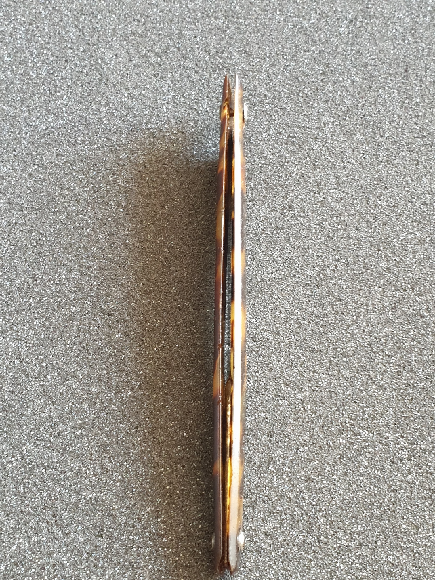 Продаётся от S&T68. Французский винтажный фреймбэк, требует некоторых работ для приведения в порядок. Ширина клинка 20мм, ручка из целлулоида, пины латунные. Все родное, бритва не разбиралась. На кромке был скольчик, он убран, но полноценная заточка не делалась. Клинок паркуется в ручку без закусываний, но с легким "закосом", на ручке грубоватая "персонализация" владельца.