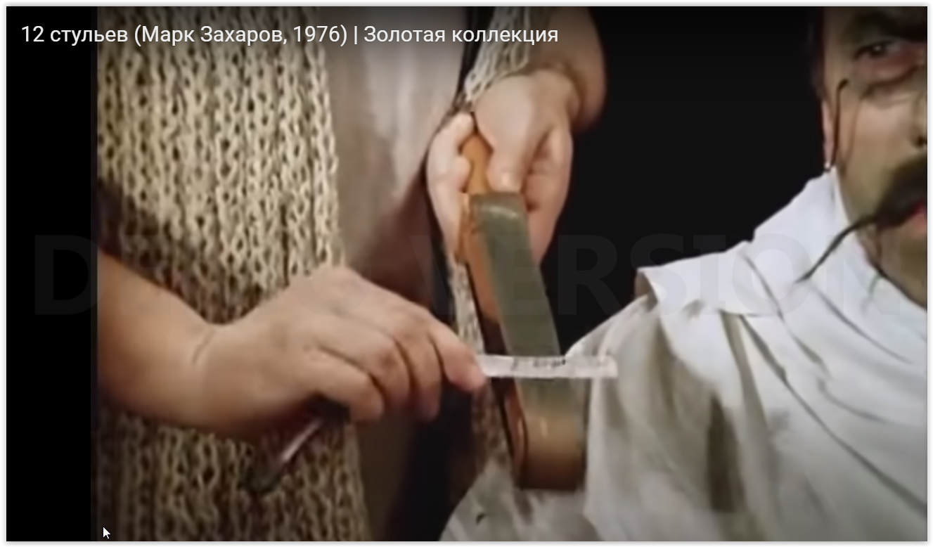 В теме уже писалось о сцене в конце фильма, но я покажу другую сцену. И так … 12 Стульев 1976 СССР Режиссёр Марк Захаров В главных ролях: Андрей Миронов и Анатолий Папанов Ссылка с привязкой ко времени: https://youtu.be/bySKrUfb8Lc?t=2792 О сцене. Остап Бендер доводить опасную бритву на колодочном пастированном ремне (кстати, ошибочно переворачивает через РК) и вот-вот начнет брить Кису. С 2013 г. с кайфом бреюсь опасной бритвой пять раз в неделю, в три прохода.