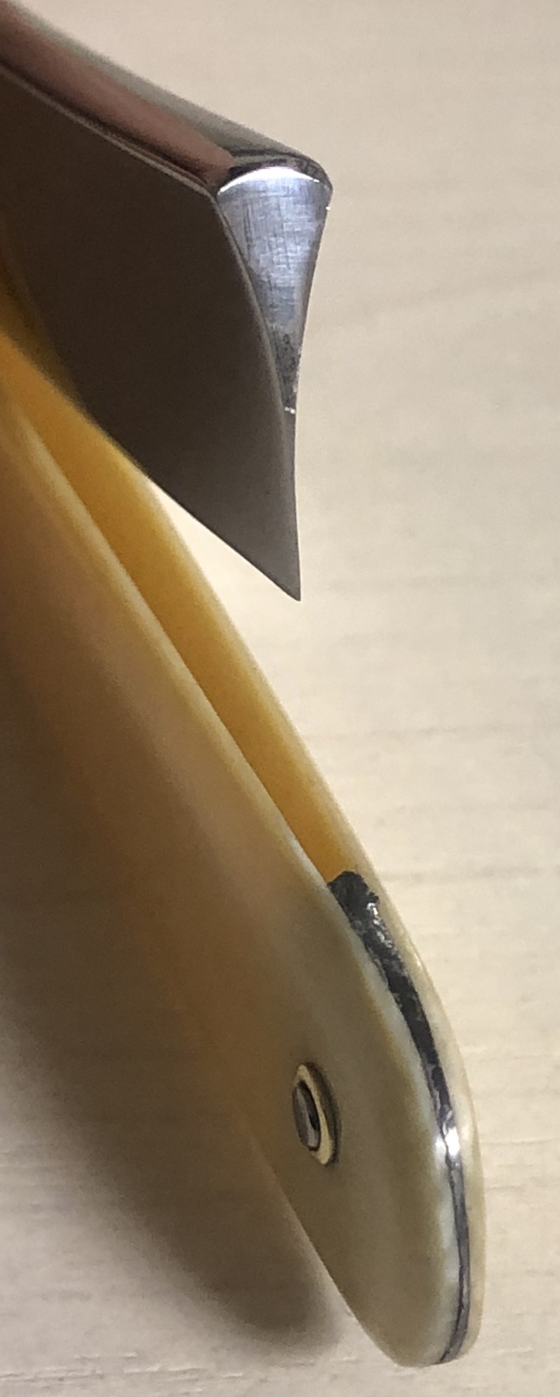 Не стал стачивать много "мяса", чтобы убрать все изъяны и рытвинки металла, а просто почистил и заточил.В целом клиночек чистый, за исключением небольшого количества у обушка.Кромочка равномерна по всей длине.Сталь очень неплохая в плане заточки, впрочем как и большинство французских бритв этого периода.Роговая оправа в очень хорошем состоянии, практически без отгрызанных мест. Массивная , тяжёлая бритва. Заточена и готова к бритью.