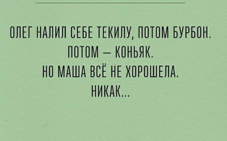 -- есть ли ещё настоящие мужчины? -- где они? -- почему мне попадается одно дерьмо? Отвечаю: -- настоящие мужчины есть; -- они разошлись по настоящим женщинам; -- подобное притягивается подобным. ...и немедленно выпил.