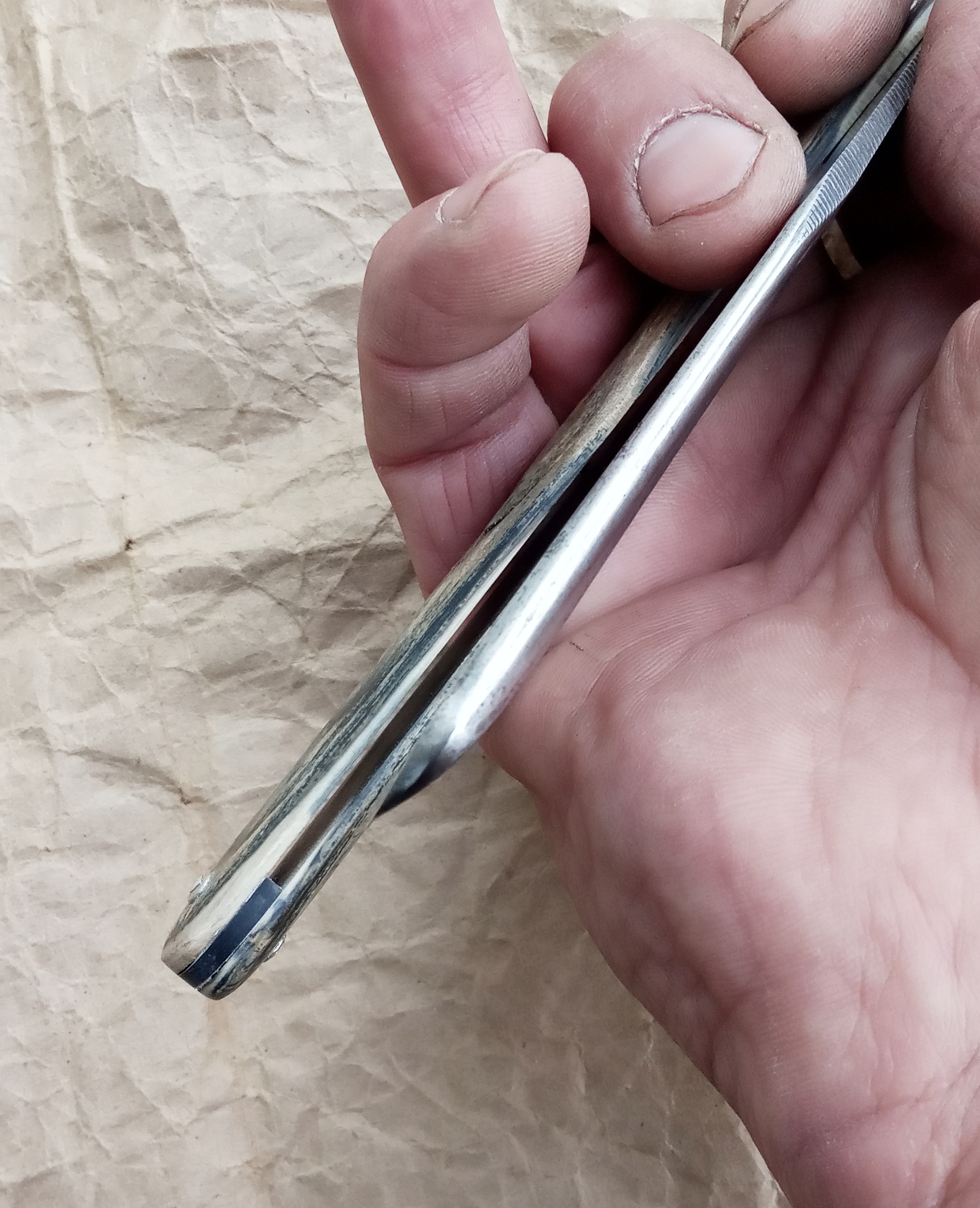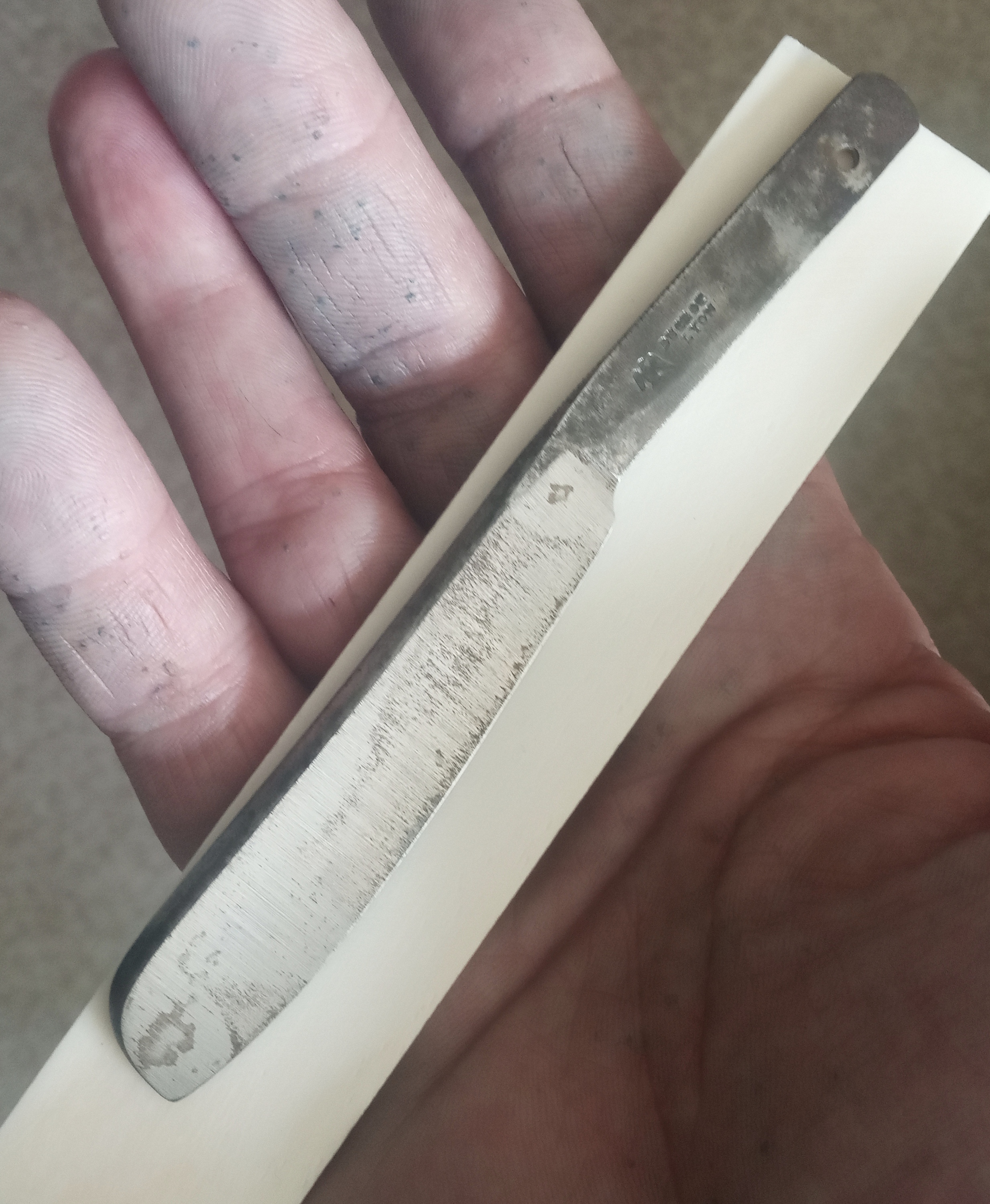 В такой ситуации нельзя поставить заклепку, просто ручка потрескается, потому что под ней нет твердой опоры. Чтобы получить ровную поверхность, пришлось бы стереть всех надписей, но я этого не хотел, поэтому шлифовал металл толко на узких участках ерла – шириной чуть больше 10 мм. На этих участках поставлю внутренних шайб из нержавеющей стали толщиной в 0,45 мм. Так как после очистки от ржавчиный диаметр осевого отверстия увеличился на 2,6 мм, впритык просверлил новое отверстие диаметром 1,8 мм для осевой заклепки. В старом отверстии поставил кусочек ненужного винтика и приклеил епоксидкой. Вот как выглядит ерл после такой обработки: Узкие участки ерла шлифуются при помощи куска стали (размер 10х10х100мм), на котором приклеивается наждачная бумага. И начал шлифовать, ех раз, да еще раз, да еще много-много раз ... В общем, участки „утонули” на около 0,20 мм ниже поверхности ерла. После заклепывания, зазор между ерлом и ручки сохранился. На фото это хорошо видно: В дальнейшем поставил ручку от „погибшей” немки и Волга обрела вторую счастливую жизнь. Я таких вещей (шлифование узких участках ерла) проделывал несколько раз и всегда с отличным результатом. Вот бритва после вышеописанной операции: С 2013 г. с кайфом бреюсь опасной бритвой пять раз в неделю, в три прохода.