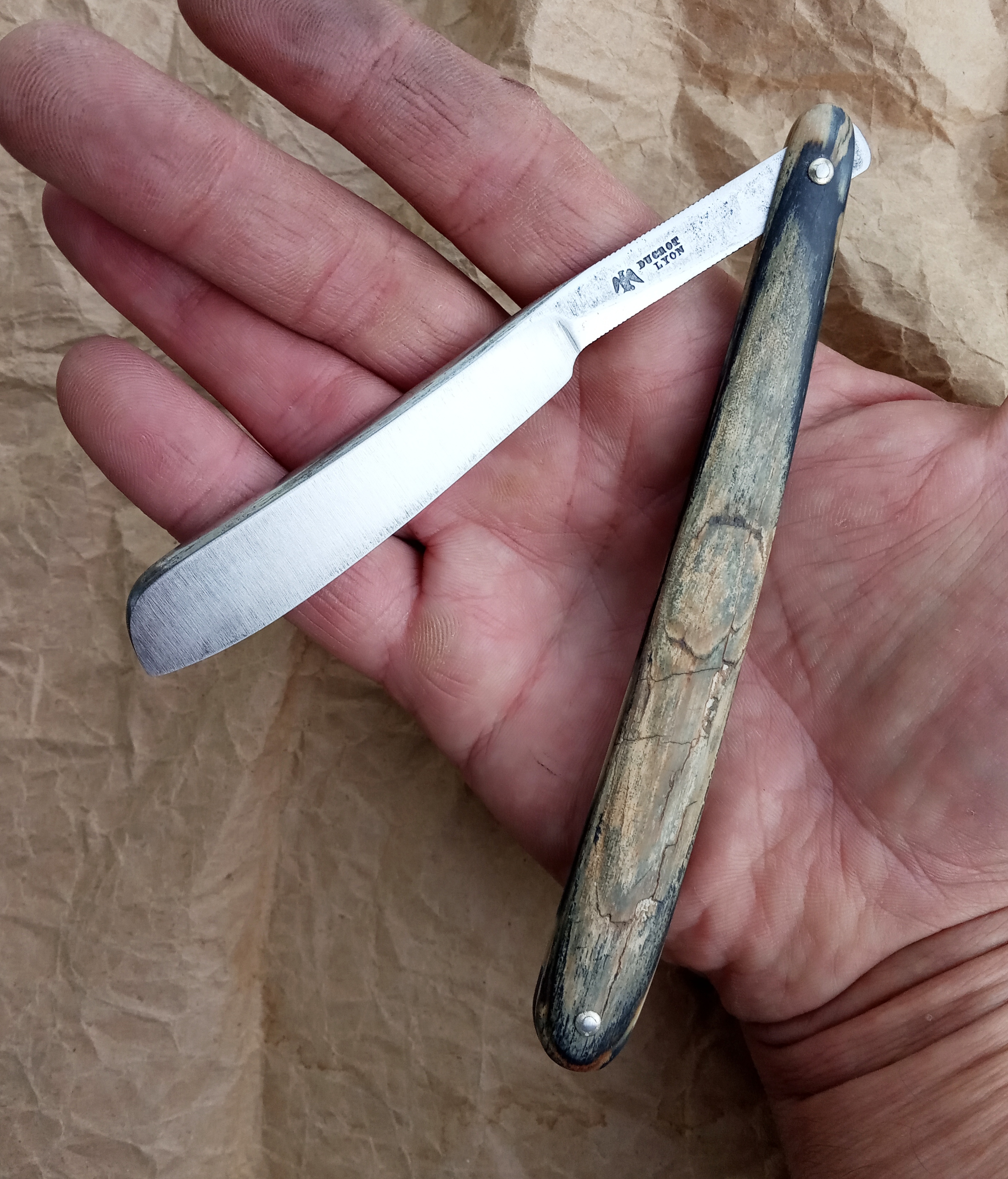 Бритва до... и после...Бронсон, плашки толстые. Просверлил два отверстия на сколе, вставил металлические штифты для надёжности. Залил эпоксидкой с древесными опилками и после обработал.