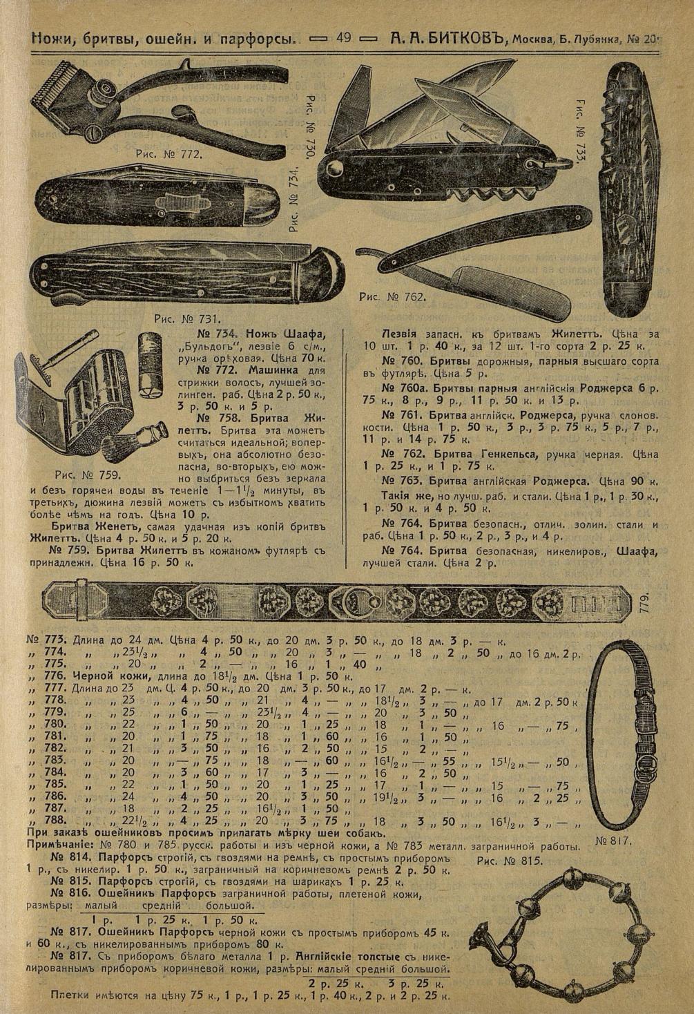 Прейс-курант. Сезон 1912/13 года. Крупнейший в Европе склад оружия, спортивных и дорожных вещей А.А. Биткова в Москве. - М., 1913. https://dlib.rsl.ru/viewer/01006693368#?page=1 Множество интересных товаров. Например, безопасная бритва Жилетт в те времена, на пике моды и маркетинговых бюджетов, в несколько раз дороже брендовых опасных бритв Роджерса и Хенкельса. Интересно в том числе, как о жиллете пишет продавец))) А "аналог" безопаски с именем "похожим до степени смешения" (как сейчас бы сказали) - в 2 раза дешевле жилеттовского оригинала. Ничего в мире не изменилось за 100 лет