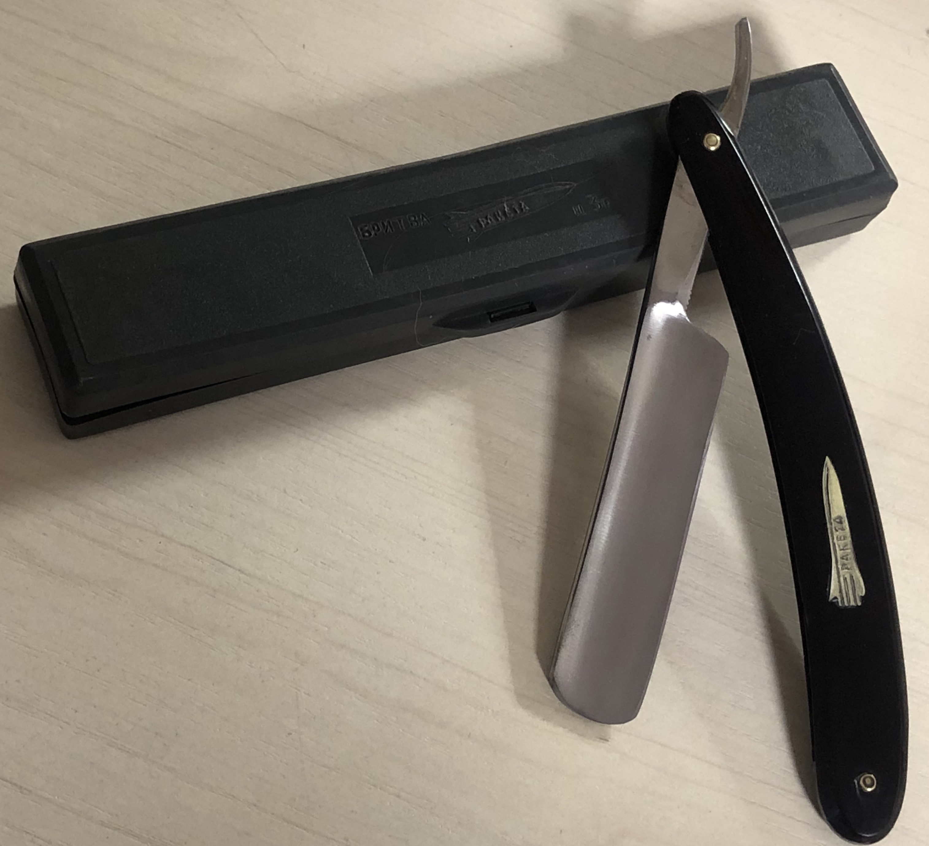 Бритву разобрал, почистил и снова собрал, добавив внутренние шайбы и сохранив оригинальные пины.Идеальная геометрия клинка:кромочка равномерна по всей длине.Очень неплохая сталь с точки зрения заточки.Думаю, что и бритье не разочарует. Родная оправа также в очень хорошем состоянии. Бритва среднего размера,без признаков активного пользования, главное, недорогая, будет отличным вариантом для новичка и просто в коллекцию.Заточена и готова к бою.