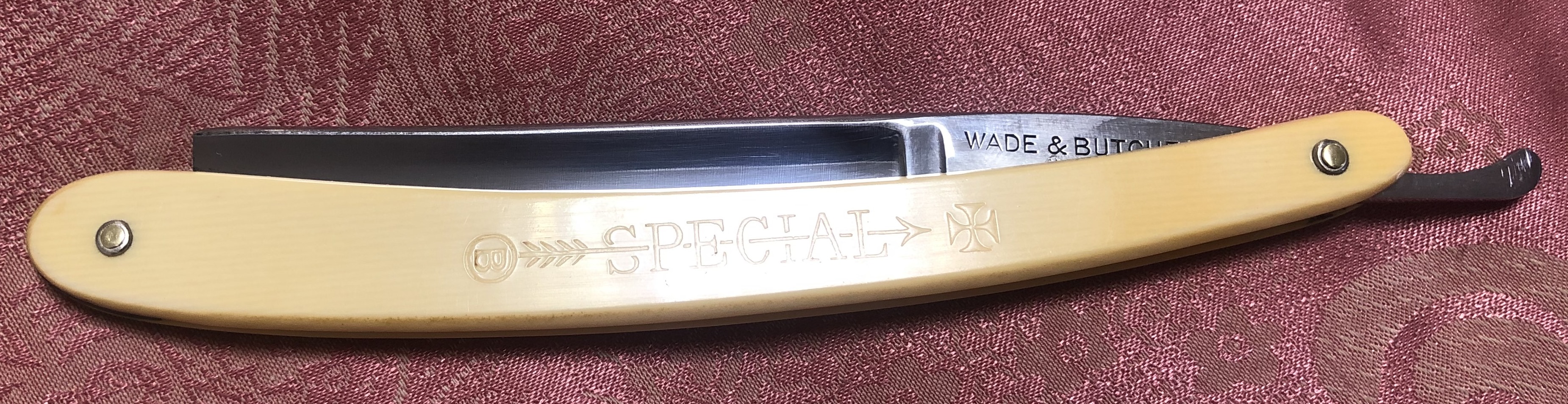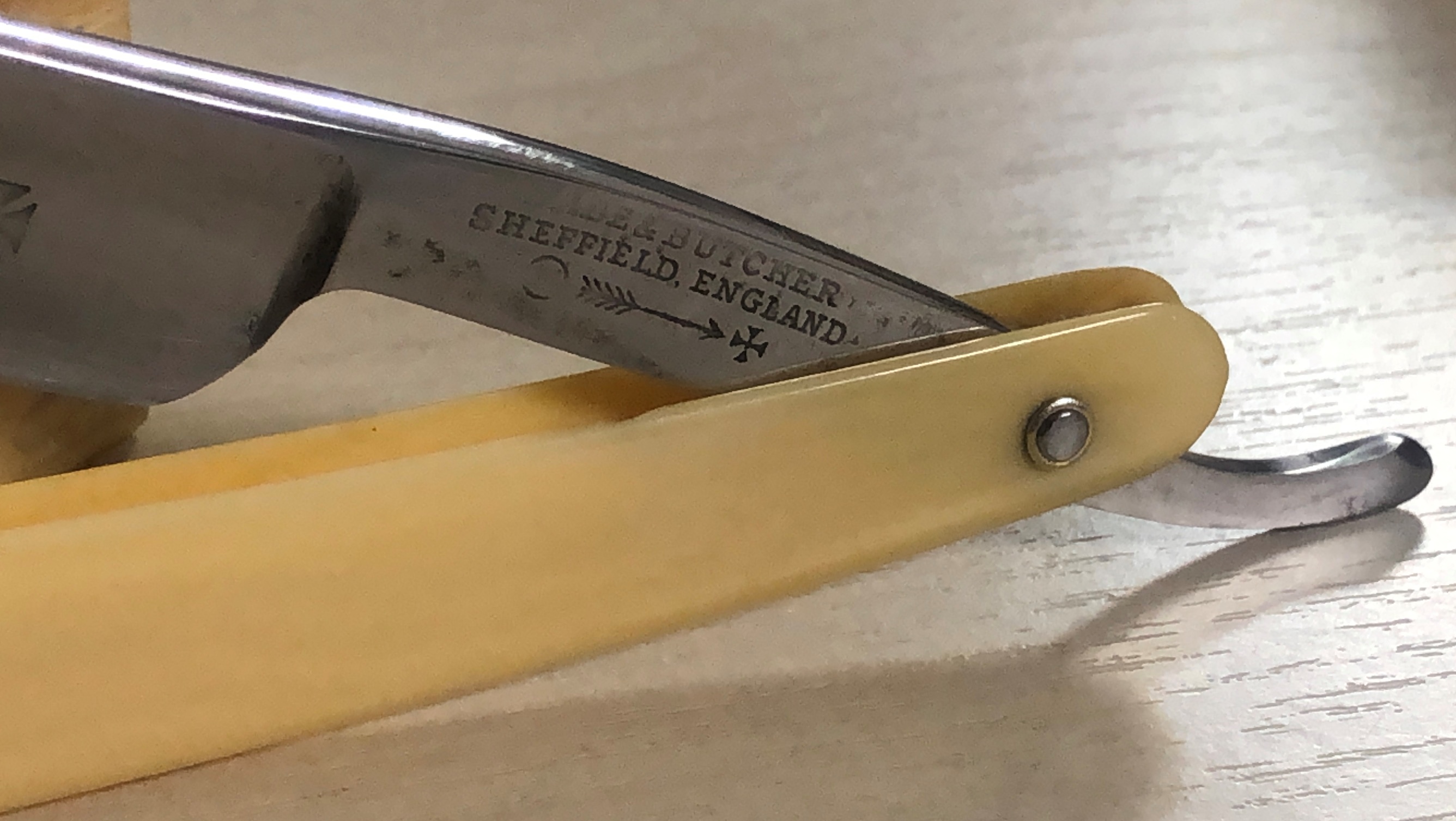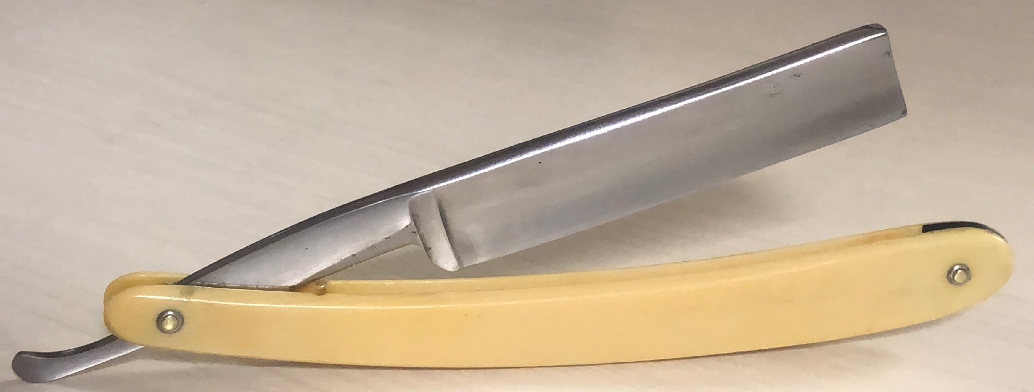 Изюминкой в компоновке данного раритета стал сюртук , пошива конца 19-го,начала 20-го веков.Имеется ввиду ручка из натуральной кости, от старинного донора. Оправа мощная, крепкая, тяжёлая, в идеальном состоянии.Пины удалось заново поставить оригинальные, от Ивасаки.Клинок в прекрасном состоянии,без видимых дефектов. Идеальная геометрия полотна:кромочка равномерна по всей длине.Сталь звонкая, отличного качества. По всем параметрам твердая, больше подошла бы для жёсткой щетины, но и для опытного пользователя будет очень неплоха. В общем и целом я доволен своей работой. На мой взгляд, отличная вещь для повседневного бритья.Заточена и готова к бритью.