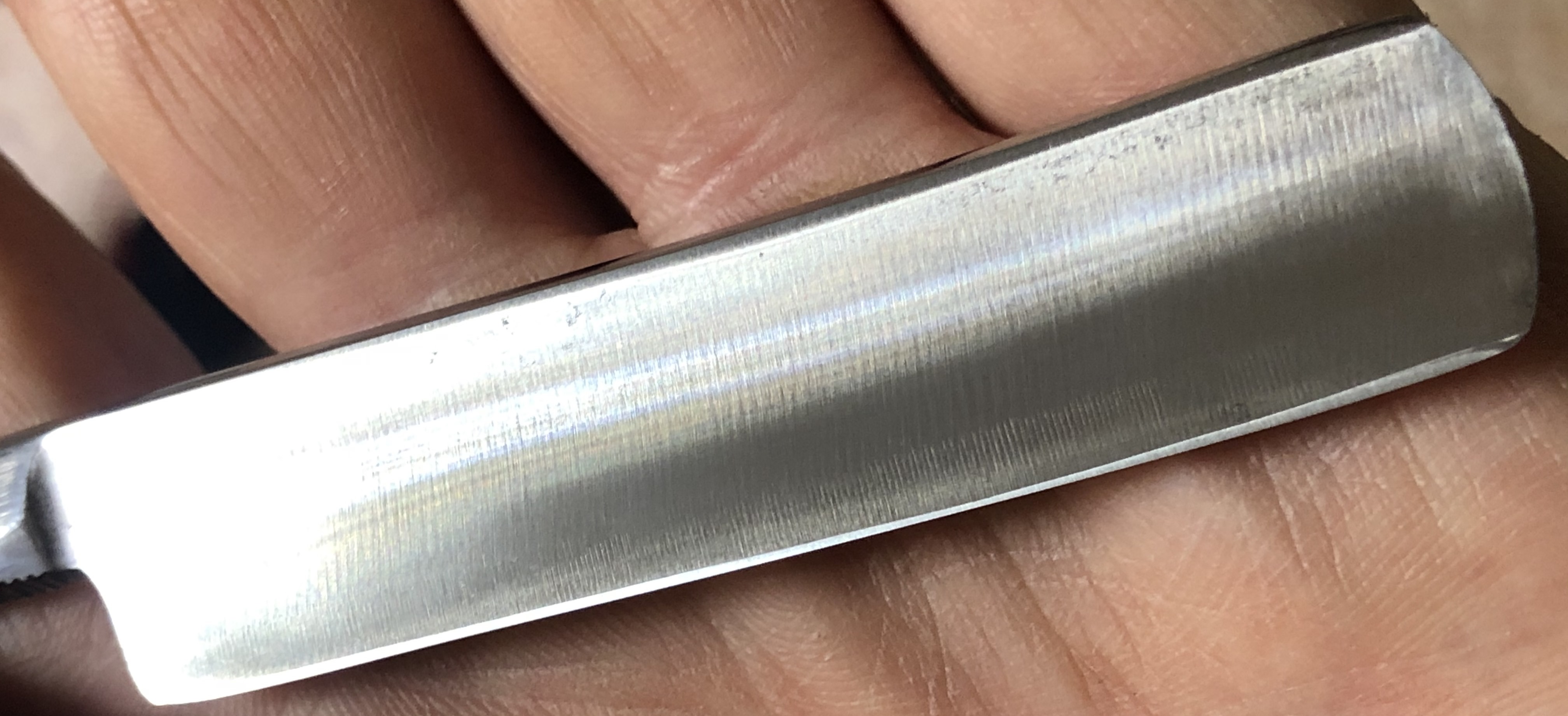 Бритва хоть и пользованная, но находится в прекрасном состоянии. Видно по равномерному износу обушка, что точили её со знанием дела и пользовались также профессионально.В этот раз мной было принято решение не делать гринд клинка, а шлифовать и полировать вручную камнями разной зернистости.Типа, по принципу обработки клинка катаны.Получился такой приятный "зеркальный сатин", с голубым оттенком металла.Никакого механического вмешательства с моей стороны!