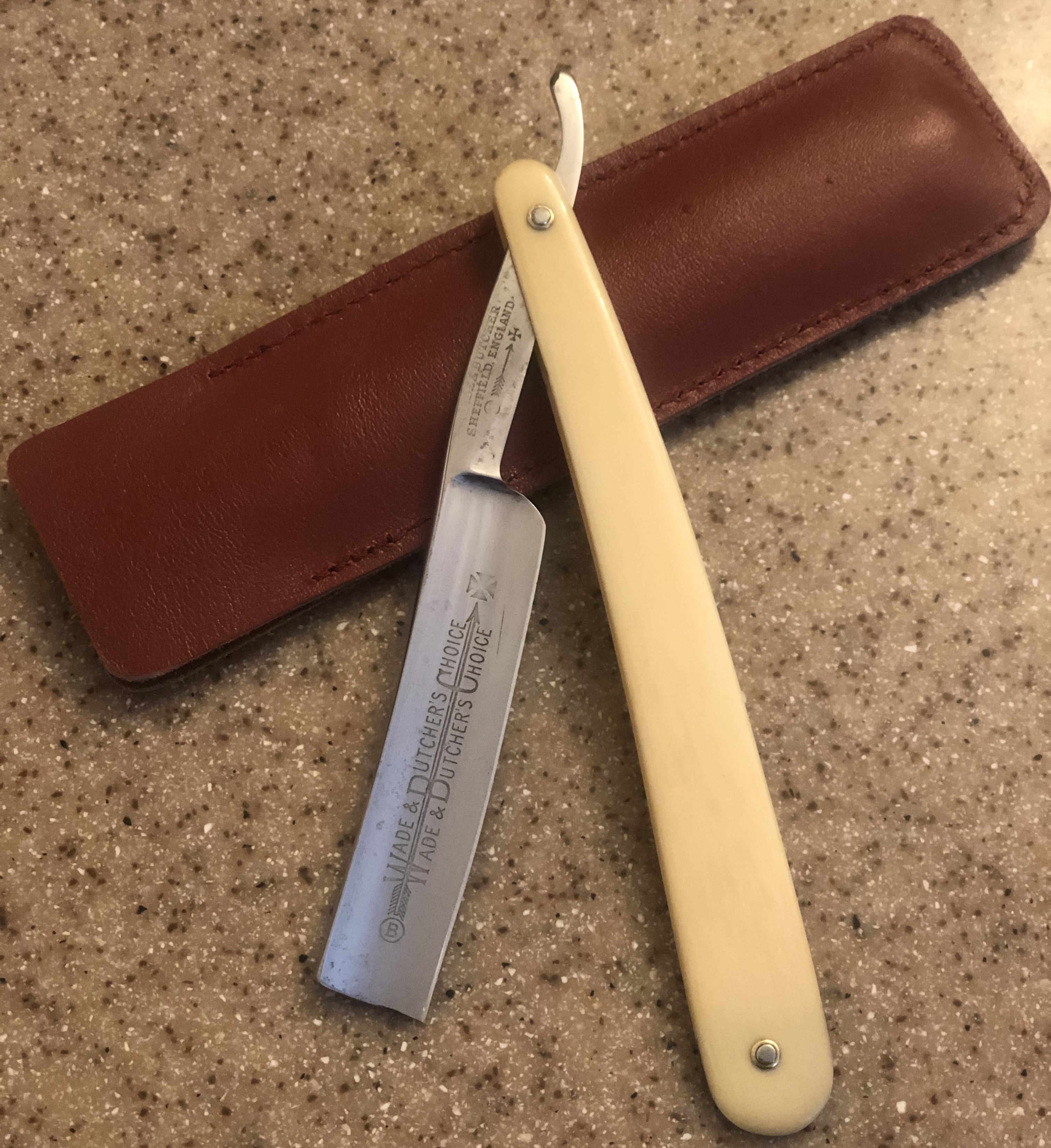 Изюминкой в компоновке данного раритета стал сюртук , пошива конца 19-го,начала 20-го веков.Имеется ввиду ручка из натуральной кости, от старинного донора. Оправа мощная, крепкая, тяжёлая, в идеальном состоянии.Пины удалось заново поставить оригинальные, от Ивасаки.Клинок в прекрасном состоянии,без видимых дефектов. Идеальная геометрия полотна:кромочка равномерна по всей длине.Сталь звонкая, отличного качества. По всем параметрам твердая, больше подошла бы для жёсткой щетины, но и для опытного пользователя будет очень неплоха. В общем и целом я доволен своей работой. На мой взгляд, отличная вещь для повседневного бритья.Заточена и готова к бритью.