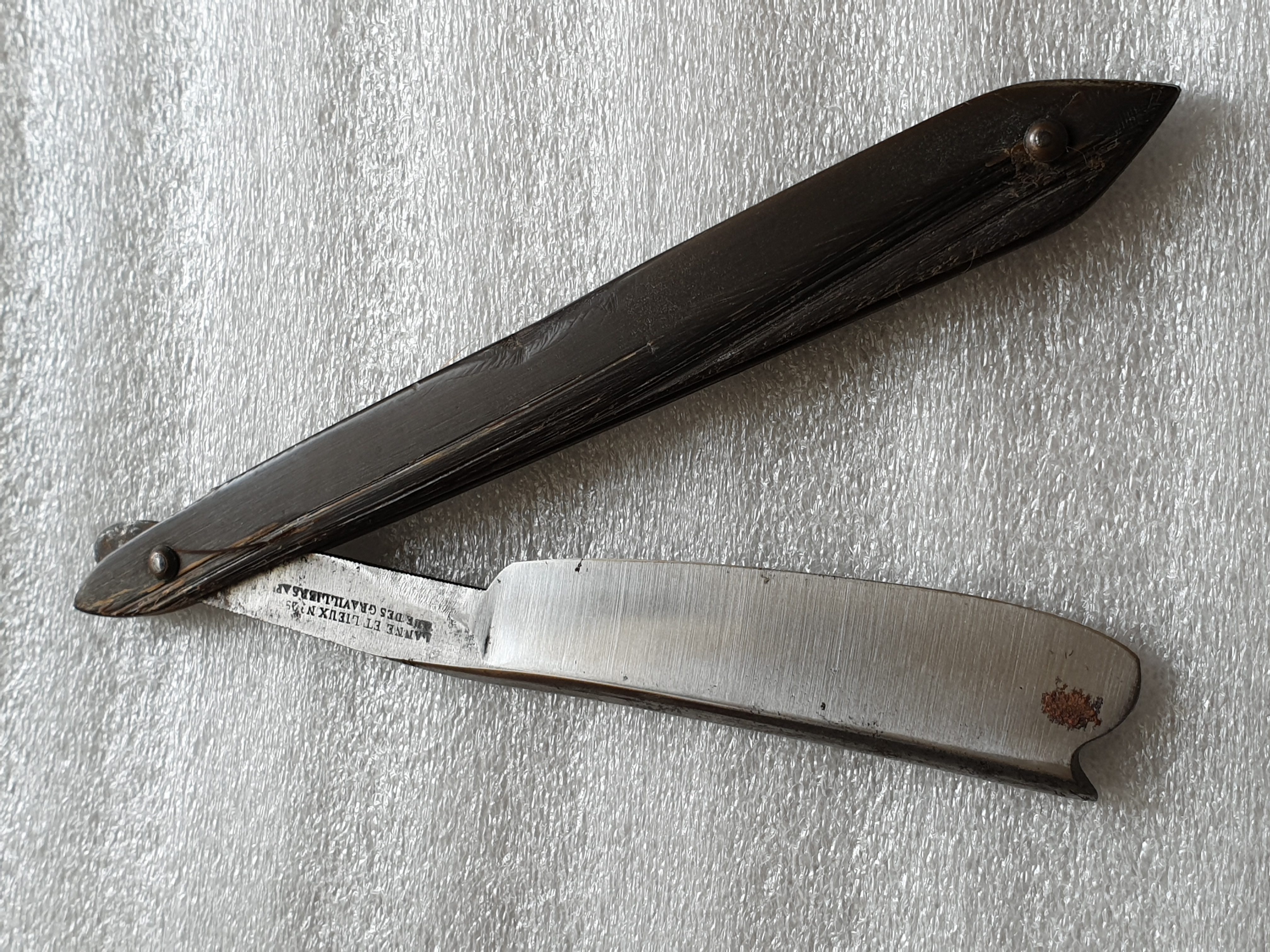 Ширина клинка 20мм, обух 5,6мм, ручка - рог, пины - железо. Все родное, бритва не разбиралась, не восстанавливалась. Одна плашка ручки в отличном состоянии, на второй имеются отслоения рога. Обе плашки ровные, клинышек между ними отсутствует. Родной гринд клинка без существенных повреждений, с двумя локальными пятнами ржавчины в месте касания клинка и ручки в сложенном положении. Клинок паркуется в ручку по центру, без перекосов и закусываний. Поиск по клейму в многотомнике Пажэ дает два упоминания, в первом случае полное совпадение и фамилий мастеров и адреса, они включены в парижский Альманах коммерции за 1830 год, как выходцы (бывшие мастера) из фирмы Pradier (см. Паже том 2, с238). Второе упоминание - совпадает только адрес (улица и номер дома из клейма на бритве), в 1839 году в парижской выставке садовых инструментов участвовала уже другая фирма с этим же адресом - Bresquignan, 29, rue des Gravilliers, à Paris (см. с888 в 3-м томе). Можно предположить, что эта бритва из эпохи французской Реставрации Бурбонов - 1815-1830-х годов. Ссылки на второй и третий тома Пажэ: https://gallica.bnf.fr/ark:/12148/bpt6k ... texteImage https://gallica.bnf.fr/ark:/12148/bpt6k ... k=107296;4 Бритва продается "как есть", ПРОДАНО Spoiler Show
