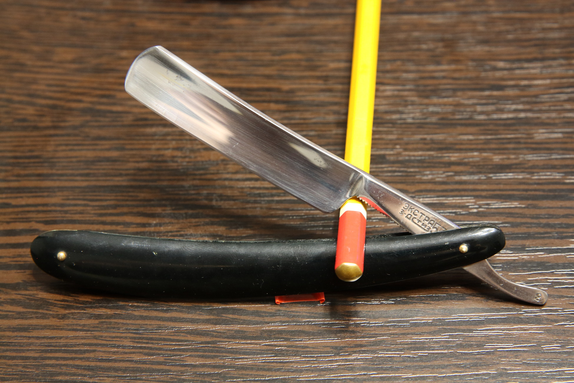 Опасная бритва Экстра, завод ЗТВ (Вача), 1957 год. Ширина полотна 18.5 мм, все родное, футляр от другой бритвы ЗТВ. Ручка у основания была лопнутая, подклеил, внутри у клинышка залил клеем. Бритву вручную почистил (осталось чуть следов времени) и заточил. Подготовлена мной к бритью. На бритвы Экстра шла сталь с несколько другой термообработкой, что оказывало влияние на повышение стойкости режущей кромки. Из-за этого бритвы Экстра ценились в парикмахерских. Отлично бреет, широкое полотно, достойная бритва. Цена - руб.