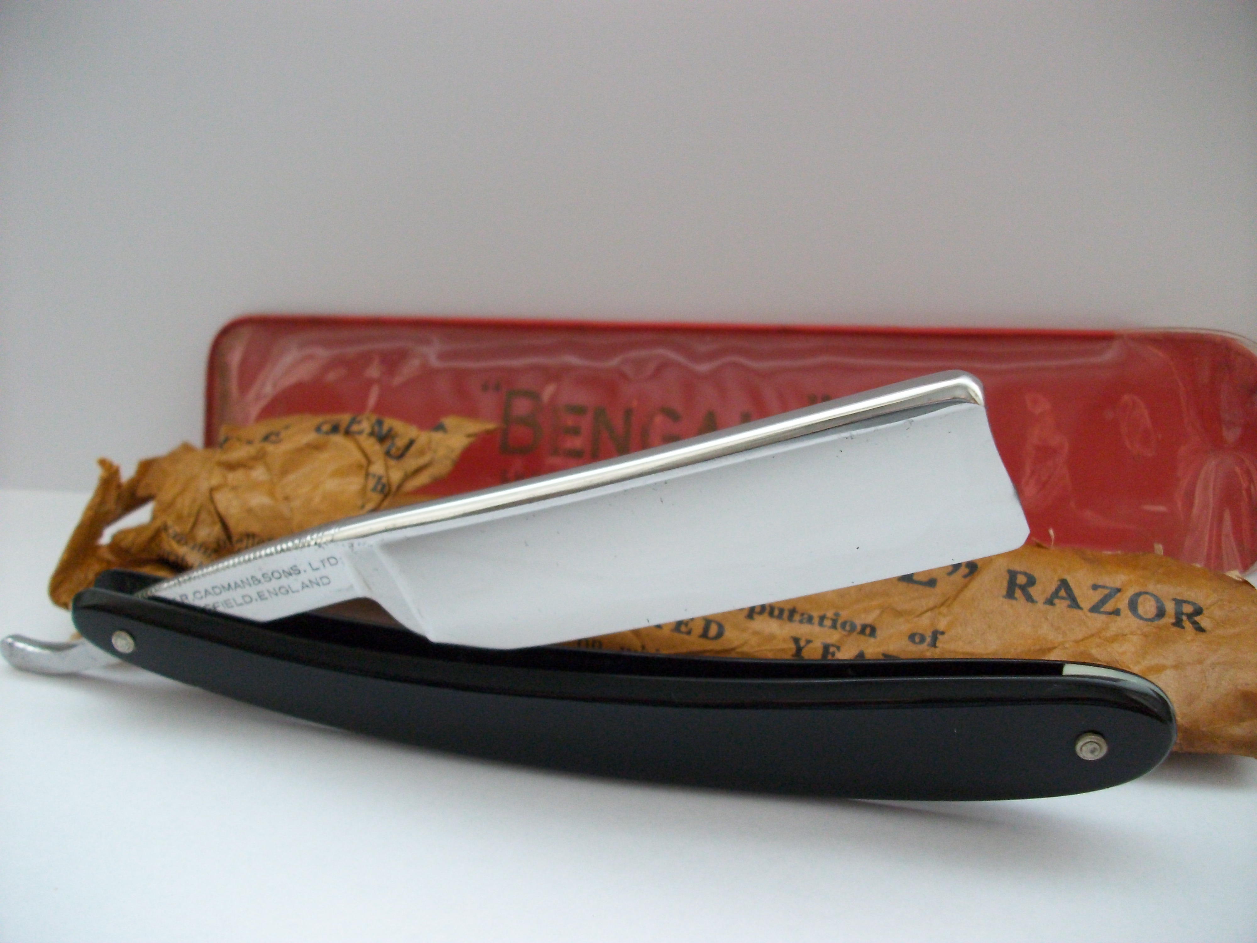 Bengall от Cadman и сыновей Шеффилд. Углеродистая сталь, ширина полотна 21мм, длина режущей кромки примерно 72мм, вогнутость полная, ручка - пластик. Бритва не была в пользовании, но годы взяли свое, бритву пришлось почистить от точечной ржи (не разбиралась). Небольшие царапки и следы времени присутствуют. Отличная сталь (мое мнение) и комфортное бритье по отзывам покупателей. Заточена и готова к бритью. Цена 13 500 Доставка включена в стоимость.
