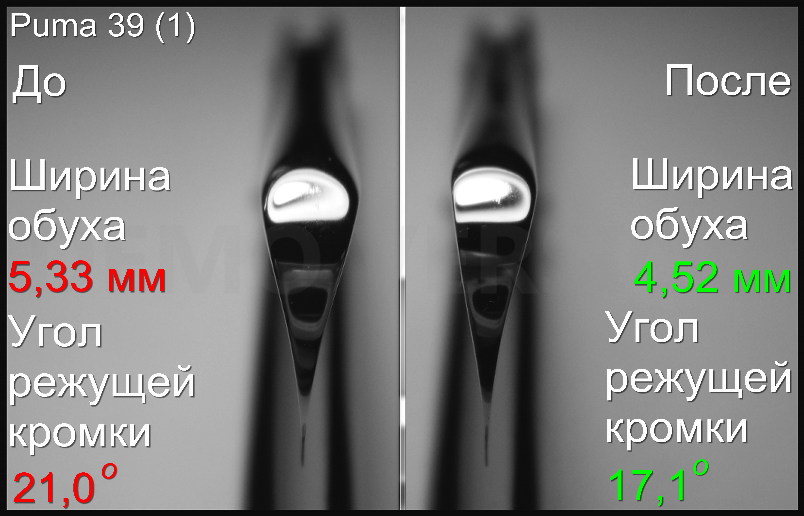 Первая часть Первый способ – сточить обух, вследствие чего уменьшится угол режущей кромки. Сначала покажу о чем идет речь а потом расскажу подробно. А сейчас напишу подробно как это сделал на примере двух бритв. Условно буду называть их Puma 39 (1) и Puma 39 (2). Про их восстановления писал здесь: viewtopic.php?p=226898#p226898 Вот они: После восстановления несколько раз брился этими бритвами но бритье идет трудновато и без комфорта. Я немножко задумался, взял штангенциркуль провел замеры и сделал вычисления. Они показали „где собака зарыта”. Оказалось, что угол режущей кромки у Puma 39 (1) = 21 градусов, а у Puma 39 (2) = 20,7 градусов. По моим мнением это объясняет почему они так плохо бреют. А если я знаю причину, значить надо действовать, то есть надо уменьшить угол режущей кромки и посмотреть какое влияние это окажет на качество бритья. Взял Puma 39 (1) обклеил изолентой режущей кромки и начал стачивать обух на наждачной бумаге Р400, приклеенная к стеклянной пластины. Понадобилось много таких пластин. Вот как они выглядят: Вот бритва во время процесса: Я посчитал приблизительно сколько нужно сточить с обуха, чтобы добиться угла около 17 градусов, но все очень непросто. Во время стачивания ширина от РК до конца полосы на обухе увеличивается и обязательно и регулярно надо останавливаться и проводить новые вычисления. Таким образом я следил за изменение угла режущей кромки. Стачивание обуха является поэтапным процессом и во время этих остановок я затачивал бритву и брился, чтобы оценить изменения комфортности бритья и стойкости кромки. Скажу, что уменьшение угла режущей кромки в 1 градус не ощущается, изменение в 2 градусов ощущается заметно, изменение в 3 градусов ощущается очень хорошо, а изменение в 3,7-3,9 градусов – это большая разница между бритье „так себе” и комфортное бритье. Я двигался шаг за шагом и когда угол достиг 17,1 градусов, а микроскопские наблюдения показали, что стойкост режущей кромки понизилась до оптимальных показателях я останавился. То есть я наблюдал изменения режущей кромки до и после бритья (величина прироста затупления), а также поведения бритвы во время бритья против роста волос. Потом сделал регринд. Тоже самое я проделал с Puma 39 (2), но там остановился когда угол достиг 17,0 градусов. Перед тем как продолжить, я должен объяснить, что для вычисления угла я измерял ширину (расстояние) от РК до конца полосы на обухе с обе стороны и брал усредненную величину. Толщина обуха измерял в средней части бритвы, то есть равноудаленно от носика и стабилизатора. Вот в чем состоит изменение параметров бритв: - у Puma 39 (1) До стачивания обух имел толщину 5.33 мм, ширину от РК до конца полосы на обухе 14.6 мм, а угол режущей кромки составлял 21.0 градусов. После стачивания обух имеет толщину 4.52 мм, ширину от РК до конца полосы на обухе 15.2 мм, а угол режущей кромки составляет 17.1 градусов. В конечном счете сточил с обуха 0,81 мм. - у Puma 39 (2) До стачивания обух имел толщину 5.42 мм, ширину от РК до конца полосы на обухе 15.1 мм, а угол режущей кромки составлял 20.7 градусов. После стачивания обух имеет толщину 4.7 мм, ширину от РК до конца полосы на обухе 15.9 мм, а угол режущей кромки составляет 17.0 градусов. В конечном счете сточил с обуха 0,72 мм. В дальнейшем я много раз брился обеими бритвами. Бритье изменилось коренным образом. Оно стало мягким и комфортным. Микроскопические наблюдения показали, что р