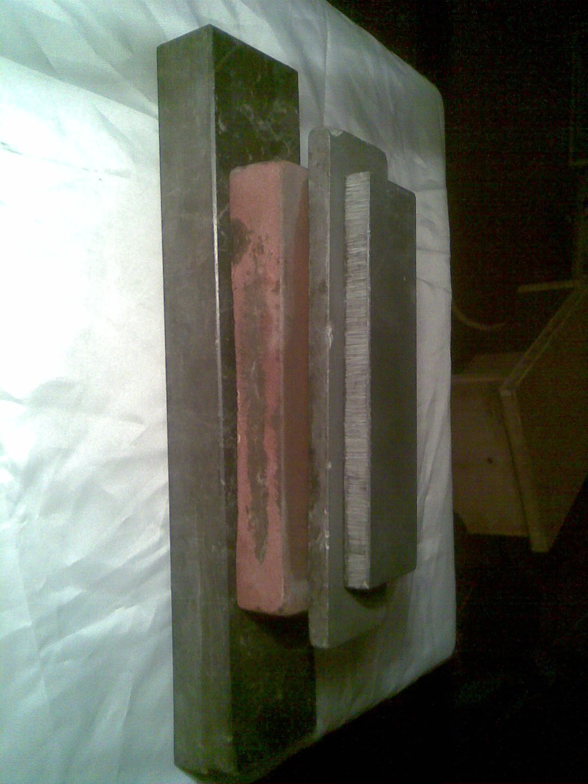 Re: Заточка на камняхЗдравствуйте!!! Два бруска, это сланцы, темно серого цвета, и разной зернистости, третий, искусственный абразив темно кирпичного цвета(примерно 1000 грит. Ориентируюсь по субъективным ощущениям). Четвертый, тот самый черно зеленый, с темно зелеными прожилками. На гранит не похож, хорошо обработан. Если у меня получится, сегодня выложу фотки.