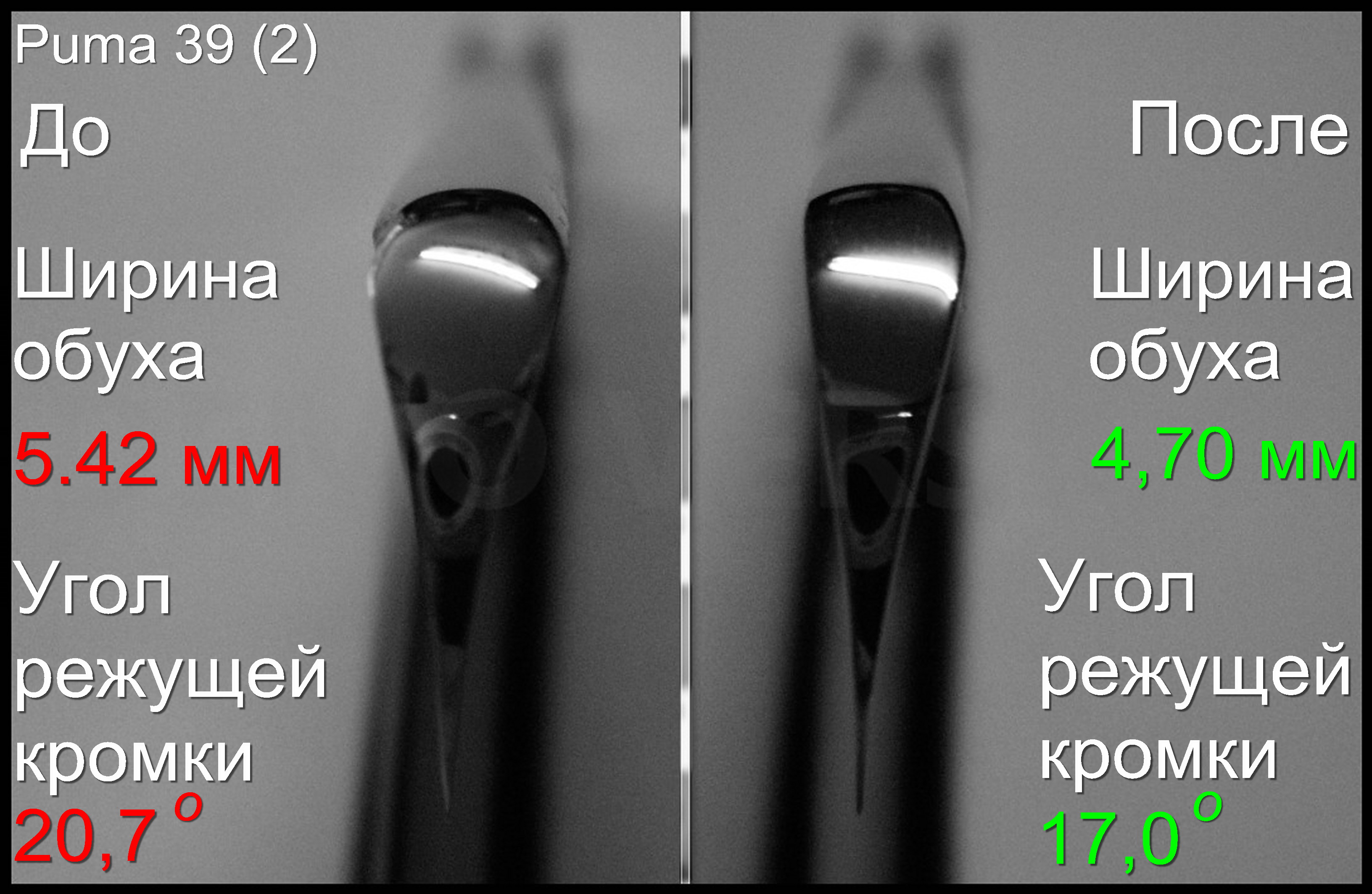Изменение угла режущей кромки – приём повышения качества бритья бэушных опасных бритв.В этой теме я покажу практически как можно улучшить качество бритья бэушных опасных бритв путем изменения угла режущей кромки.  Первая часть Первый способ – сточить обух, вследствие чего уменьшится угол режущей кромки. Сначала покажу о чем идет речь а потом расскажу подробно. А сейчас напишу подробно как это сделал на примере двух бритв. Условно буду называть их Puma 39 (1) и Puma 39 (2). Про их восстановления писал здесь: viewtopic.php?p=226898#p226898 Вот они: После восстановления несколько раз брился этими бритвами но бритье идет трудновато и без комфорта. Я немножко задумался, взял штангенциркуль провел замеры и сделал вычисления. Они показали „где собака зарыта”. Оказалось, что угол режущей кромки у Puma 39 (1) = 21 градусов, а у Puma 39 (2) = 20,7 градусов. По моим мнением это объясняет почему они так плохо бреют. А если я знаю причину, значить надо действовать, то есть надо уменьшить угол режущей кромки и посмотреть какое влияние это окажет на качество бритья. Взял Puma 39 (1) обклеил изолентой режущей кромки и начал стачивать обух на наждачной бумаге Р400, приклеенная к стеклянной пластины. Понадобилось много таких пластин. Вот как они выглядят: Вот бритва во время процесса: Я посчитал приблизительно сколько нужно сточить с обуха, чтобы добиться угла около 17 градусов, но все очень непросто. Во время стачивания ширина от РК до конца полосы на обухе увеличивается и обязательно и регулярно надо останавливаться и проводить новые вычисления. Таким образом я следил за изменение угла режущей кромки. Стачивание обуха является поэтапным процессом и во время этих остановок я затачивал бритву и брился, чтобы оценить изменения комфортности бритья и стойкости кромки. Скажу, что уменьшение угла режущей кромки в 1 градус не ощущается, изменение в 2 градусов ощущается заметно, изменение в 3 градусов ощущается очень хорошо, а изменение в 3,7-3,9 градусов – это большая разница между бритье „так себе” и комфортное бритье. Я двигался шаг за шагом и когда угол достиг 17,1 градусов, а микроскопские наблюдения показали, что стойкост режущей кромки понизилась до оптимальных показателях я останавился. То есть я наблюдал изменения режущей кромки до и после бритья (величина прироста затупления), а также поведения бритвы во время бритья против роста волос. Потом сделал регринд. Тоже самое я проделал с Puma 39 (2), но там остановился когда угол достиг 17,0 градусов. Перед тем как продолжить, я должен объяснить, что для вычисления угла я измерял ширину (расстояние) от РК до конца полосы на обухе с обе стороны и брал усредненную величину. Толщина обуха измерял в средней части бритвы, то есть равноудаленно от носика и стабилизатора. Вот в чем состоит изменение параметров бритв: - у Puma 39 (1) До стачивания обух имел толщину 5.33 мм, ширину от РК до конца полосы на обухе 14.6 мм, а угол режущей кромки составлял 21.0 градусов. После стачивания обух имеет толщину 4.52 мм, ширину от РК до конца полосы на обухе 15.2 мм, а угол режущей кромки составляет 17.1 градусов. В конечном счете сточил с обуха 0,81 мм. - у Puma 39 (2) До стачивания обух имел толщину 5.42 мм, ширину от РК до конца полосы на обухе 15.1 мм, а угол режущей кромки составлял 20.7 градусов. После стачивания обух имеет толщину 4.7 мм, ширину от РК до конца полосы на обухе 15.9 мм, а угол режущей кромки соста