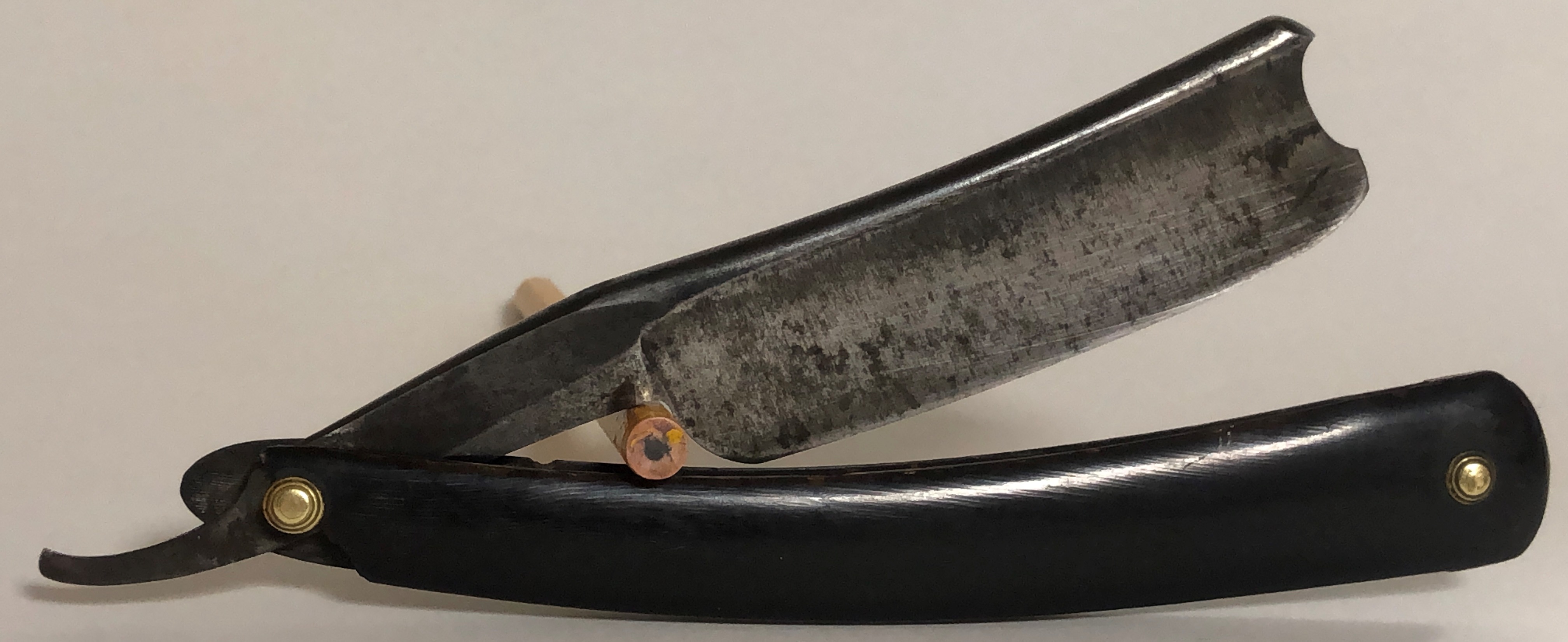 Бритва до... и после...Появился в хозяйстве почтенного возраста безымянный француз. Клин довольно старый, сработан около 1870 года. Одна из плашек оправы была выгнута, родные стальные шайбы съела ржа. Поэтому производилась полная разборка. Плашку варил раза три пока не выровнялась. Так что ручку оставил родную.