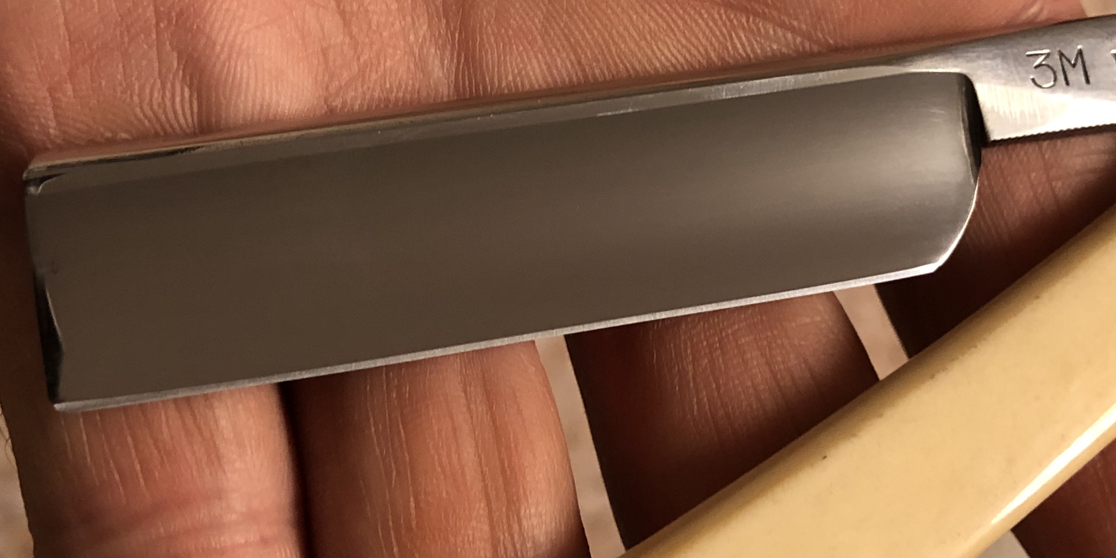 Бритва хоть и пользованная, но находится в прекрасном состоянии. Видно по равномерному износу обушка, что точили её со знанием дела и пользовались также профессионально.В этот раз мной было принято решение не делать гринд клинка, а шлифовать и полировать вручную камнями разной зернистости.Типа, по принципу обработки клинка катаны.Получился такой приятный "зеркальный сатин", с голубым оттенком металла.Никакого механического вмешательства с моей стороны!