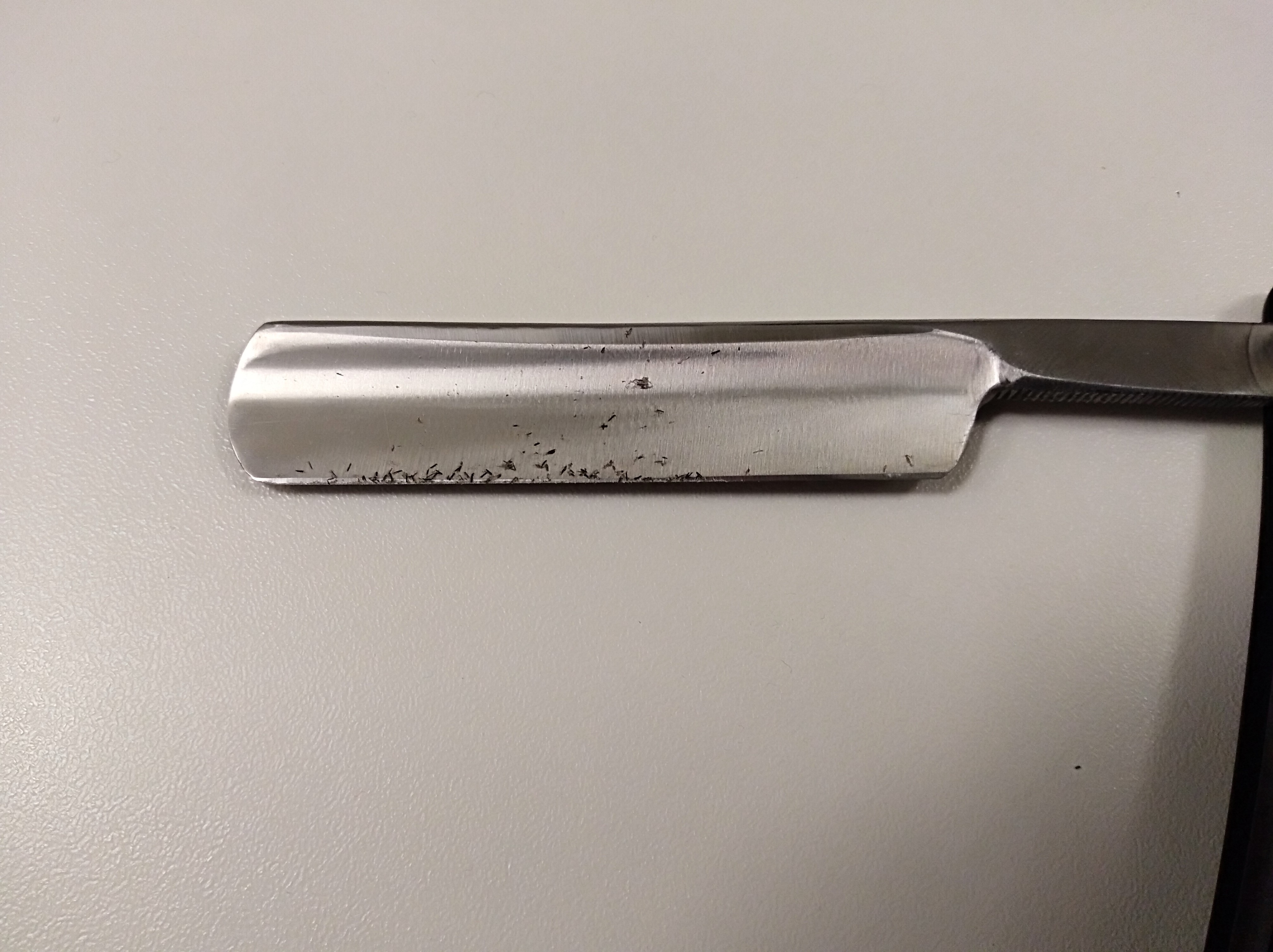 Итак, взял в руки очень острого ( как ни странно ) стиза, который сносит играючи любую щетину, и если немного не угадать с углом то и верхний слой кожи тоже. Решил попробовать бриться без подготовки. Начал сразу против роста, первый сантиметр в районе кадыка сбрил в принципе нормально, потом просто нещаднейше начало драть. Просто экзекуция. Переключился на правую щеку, по росту. Что сказать? В принципе бреет более - менее. Но чувствуется, что бритва все - таки тянет волос, есть пропуски, и самое неожиданное - снимает ороговевшую кожу. В целом приятного ожидаемо мало, но я все - же попробовал, больше не хочу Да, на фаске остался нормальный такой слой кожи, сфоткал как смог... Бритьё опасной бритвой на сухуюКаждый малейший шаг на поле свободного мышления и лично формируемой жизни всегда завоевывается ценой духовных и физических мучений.