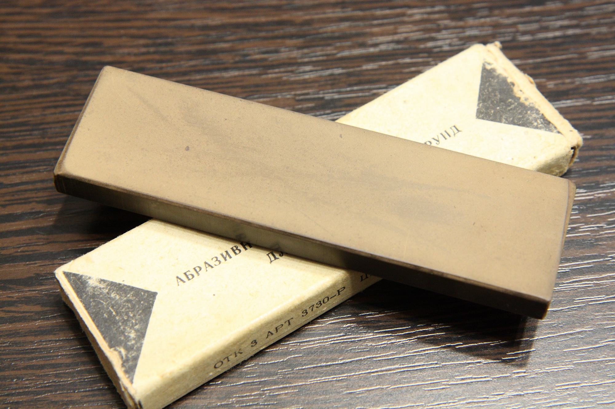 Абразивный брусок микрокорунд для правки опасных бритв (по факту для этапов заточки в районе 3000 грит), но так же отлично подойдет для правки/подточки ножей, сделан в СССР. Работает с водой, одну сторону подготовил к работе на порошках до F400. Размеры 120х35х10 мм, родная коробочка. Бритва лежит для масштаба и не продается. Цена - руб.