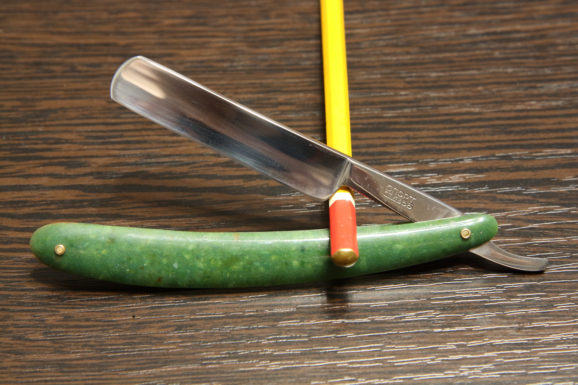Опасная бритва Спорт, завод СТИЗ, 1956 год. Ширина полотна 16 мм, все родное, футляр тоже. Пришла с заводской заточкой, но с кривоватым полотном. Пришла с заводской заточкой. Почистил вручную пастами и заточил, подготовлена мной к бритью. Геометрия не идеал, но заточку я вывел полностью, в последующем затачиваться и правиться будет без проблем. Интересная бритва середины 50х, бреет приятно и не агрессивно, симпатичная зеленая ручка. Хорошая углеродка. Цена - руб.